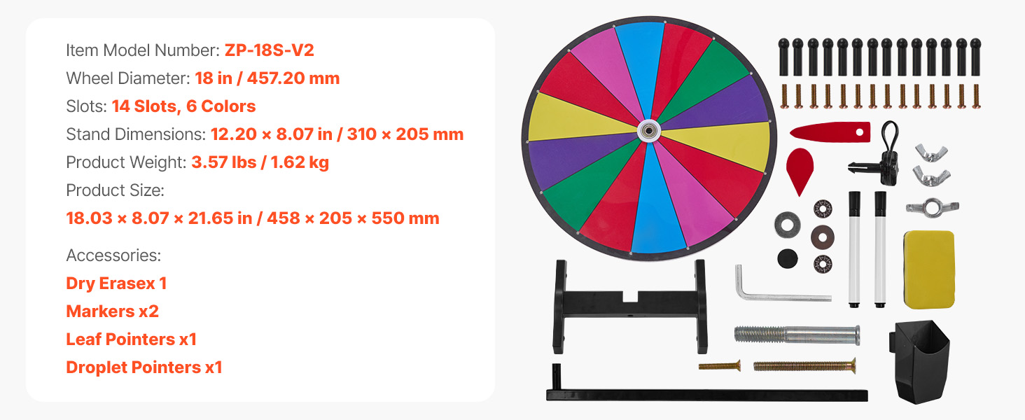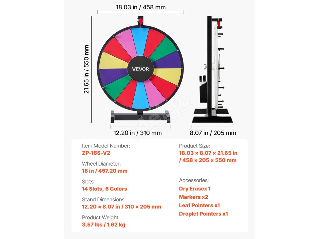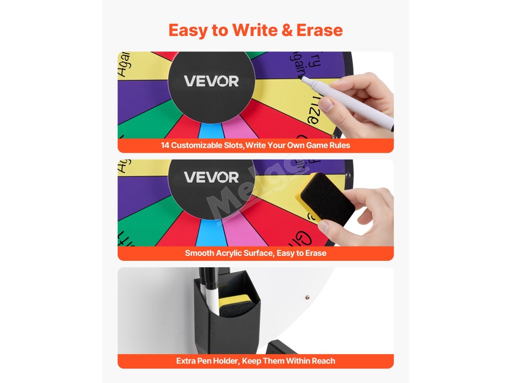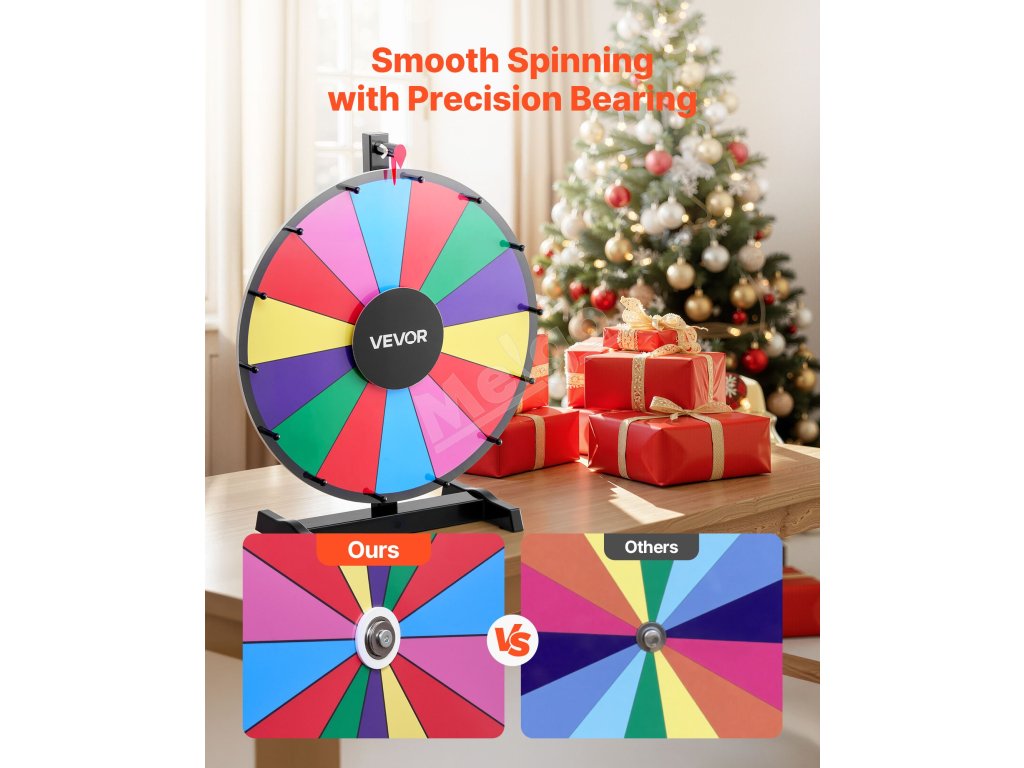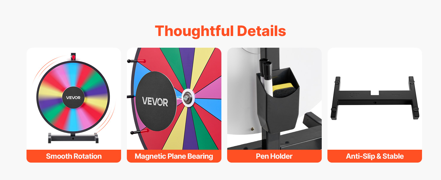 Hladké otáčanie s presným ložiskom a protišmykovou základňou zabezpečuje stabilné a bezpečné používanie. Točiace sa koleso s výhrami sa dodáva s držiakom na pero na jednoduché skladovanie.