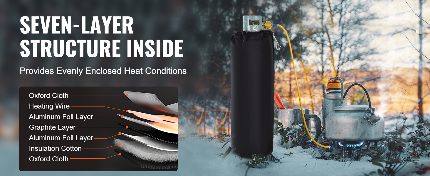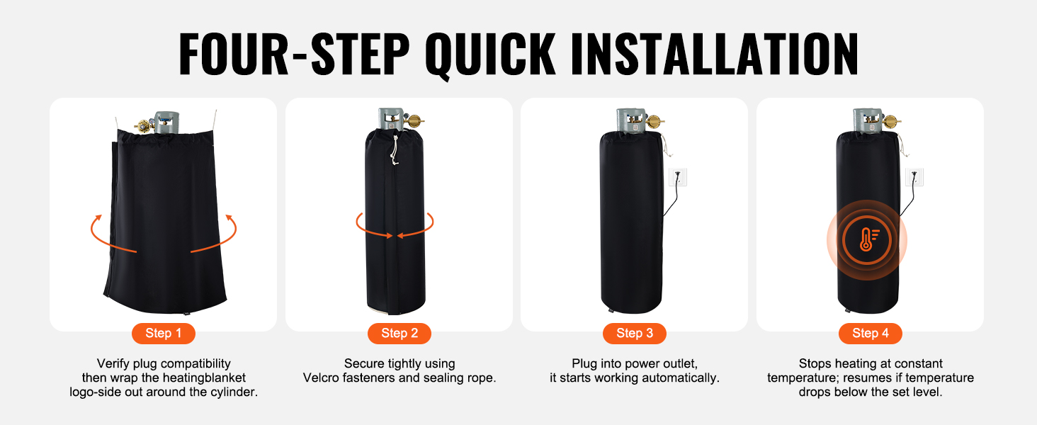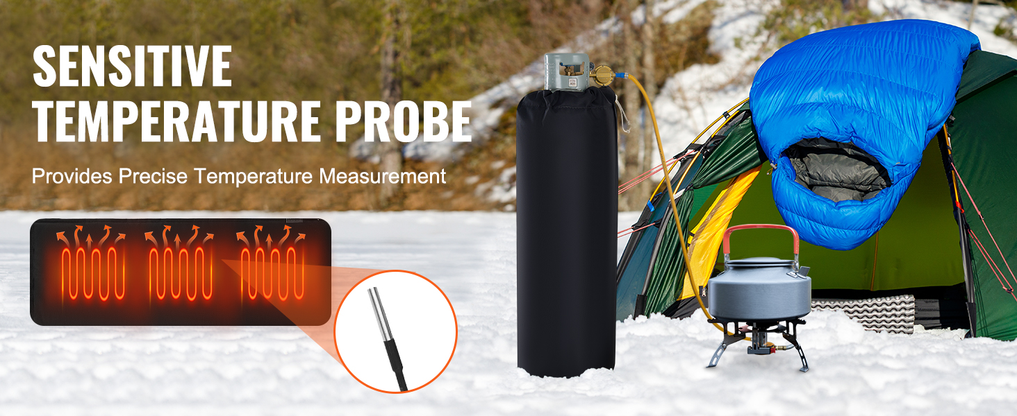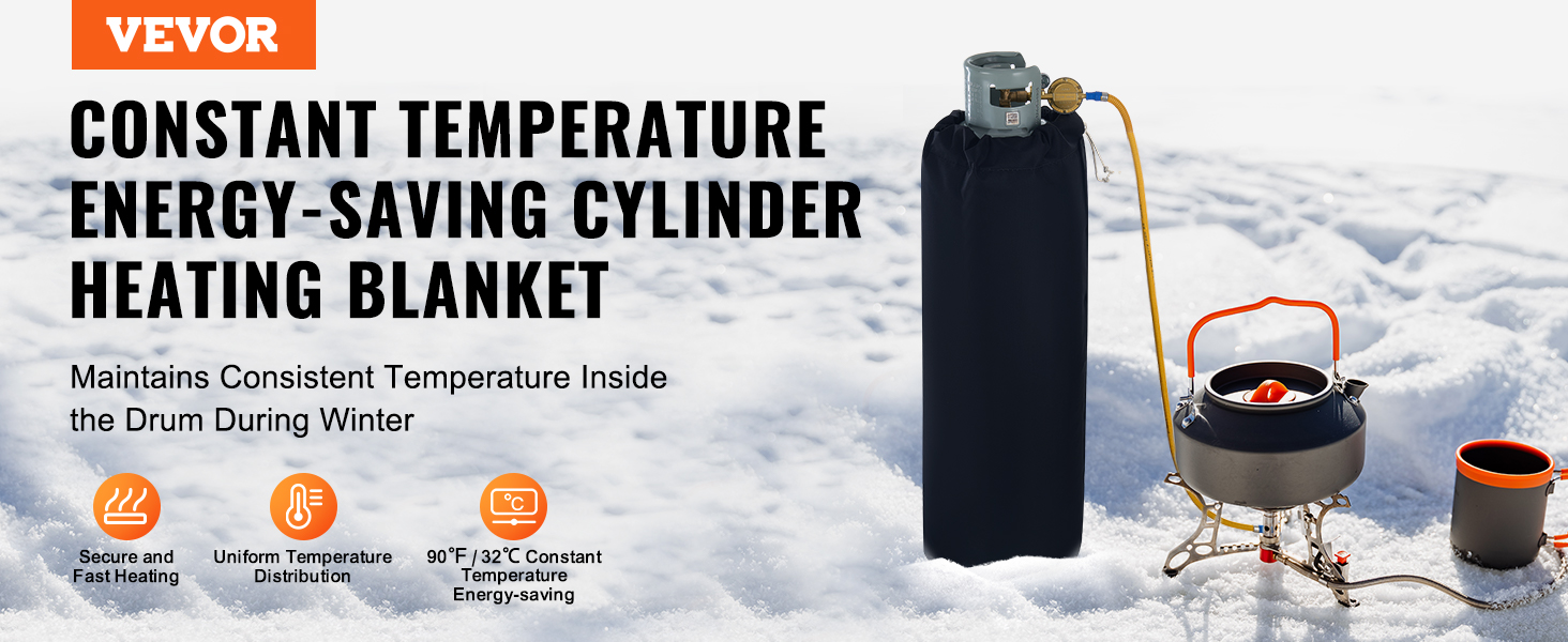 Vykurovacia deka VEVOR na propánové fľaše rýchlo a rovnomerne ohrieva vašu fľašu. Po dosiahnutí teploty 90℉/32 ℃ udržiava konštantnú teplotu, čím zabraňuje plytvaniu energiou v dôsledku nízkych teplôt počas výstupu plynu.
