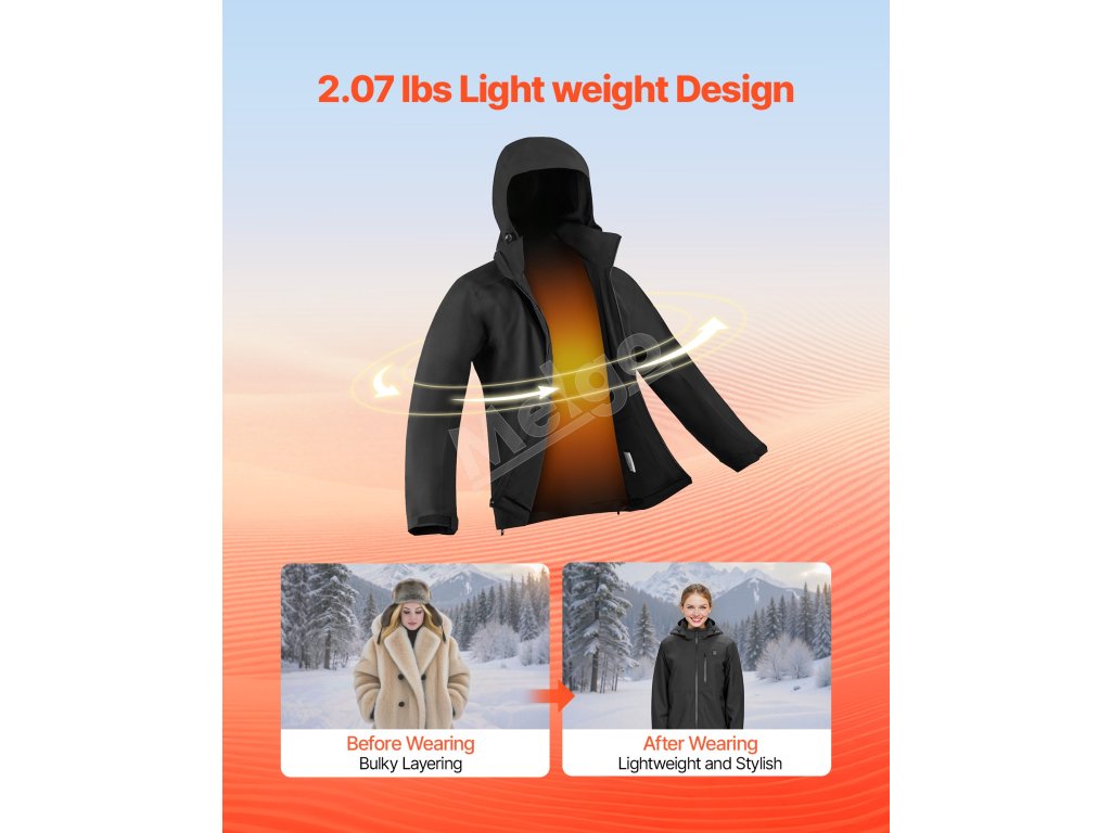 Má 5 vyhrievacích zón z uhlíkových vlákien (ruky, brucho, chrbát) s 3 úrovňami tepla až do 140℉. Napájaná 7,4 V 8000 mAh batériou pre 6-10 h tepla. Vodoodolná tkanina vhodná na turistiku, kempovanie, lyžovanie, rybárčenie a lov.