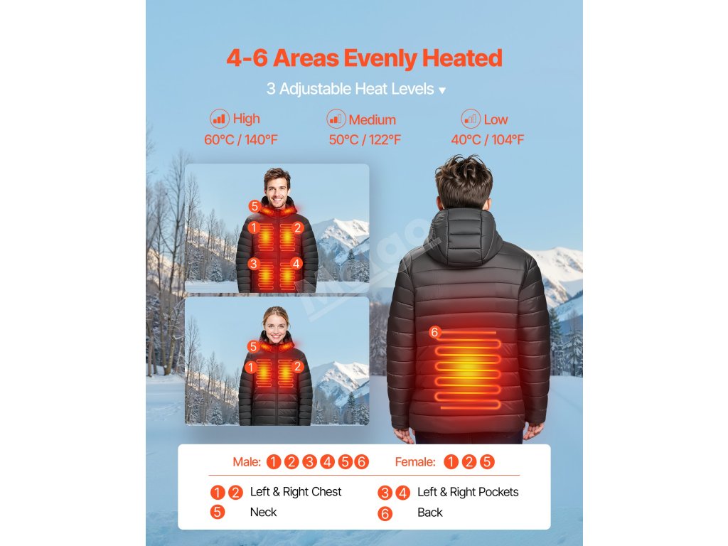 Vyhrievaná bunda s prvkami z uhlíkových vlákien. Dodáva cielené teplo do viacerých oblastí jadra: vrecká (len pre mužov), hrudník, golier a chrbát. Disponuje 3 úrovňami tepla až do 140℉, napájaná 7,4 V 8000 mAh batériou na 4-10 h vyhrievania. Ľahká polstrovaná tkanina vás udrží v teple pri turistike, kempovaní alebo love.