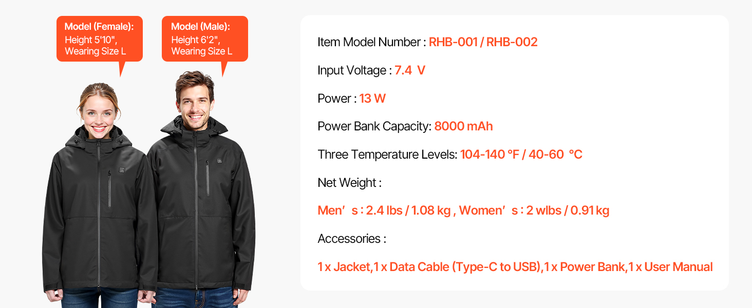 Má 5 vyhrievacích zón z uhlíkových vlákien (ruky, brucho, chrbát) s 3 úrovňami tepla až do 140℉. Napájaná 7,4 V 8000 mAh batériou pre 6-10 h tepla. Vodoodolná tkanina vhodná na turistiku, kempovanie, lyžovanie, rybárčenie a lov.
