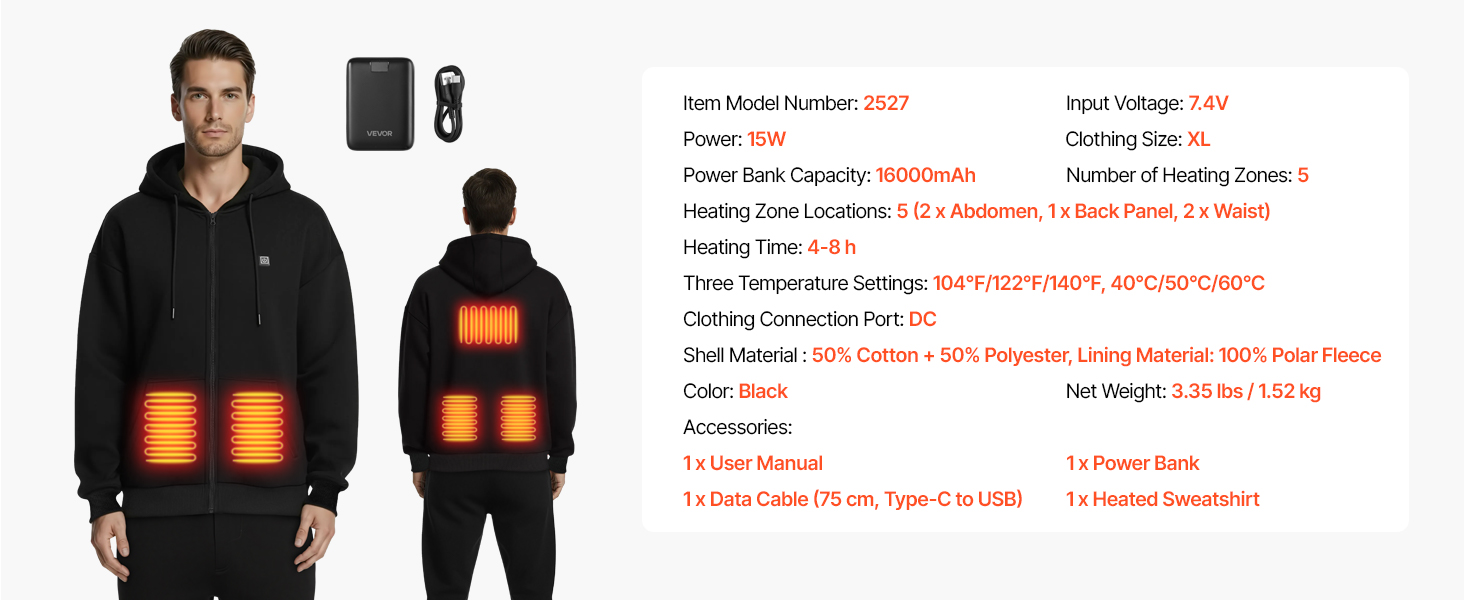 Táto vyhrievaná mikina má 5-zónové vyhrievanie z uhlíkových vlákien pre rýchle a rovnomerné teplo. Podporuje tri nastaviteľné stupne teploty s rýchlonabíjacou powerbankou s kapacitou 16 000 mAh. Je vyrobená z prvotriednej tkaniny, poskytuje odolnosť a pohodlie pri praní v práčke na zimné nosenie.