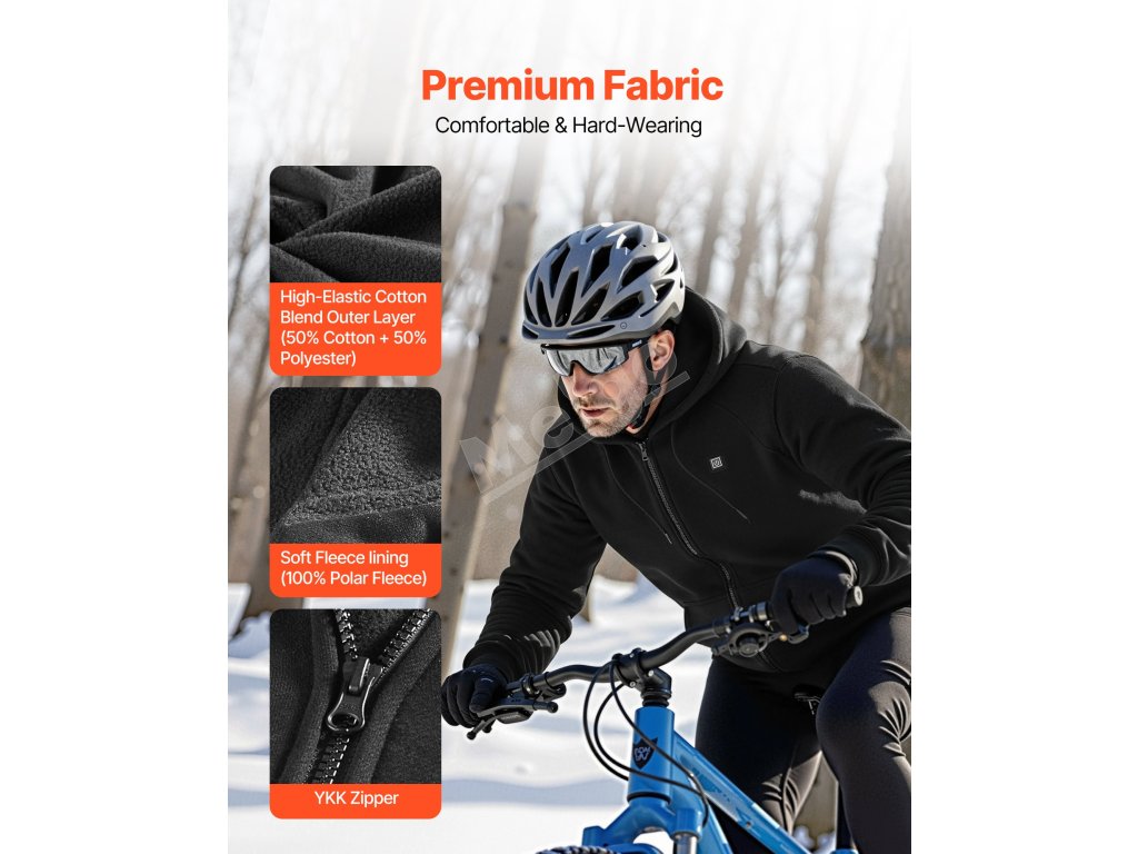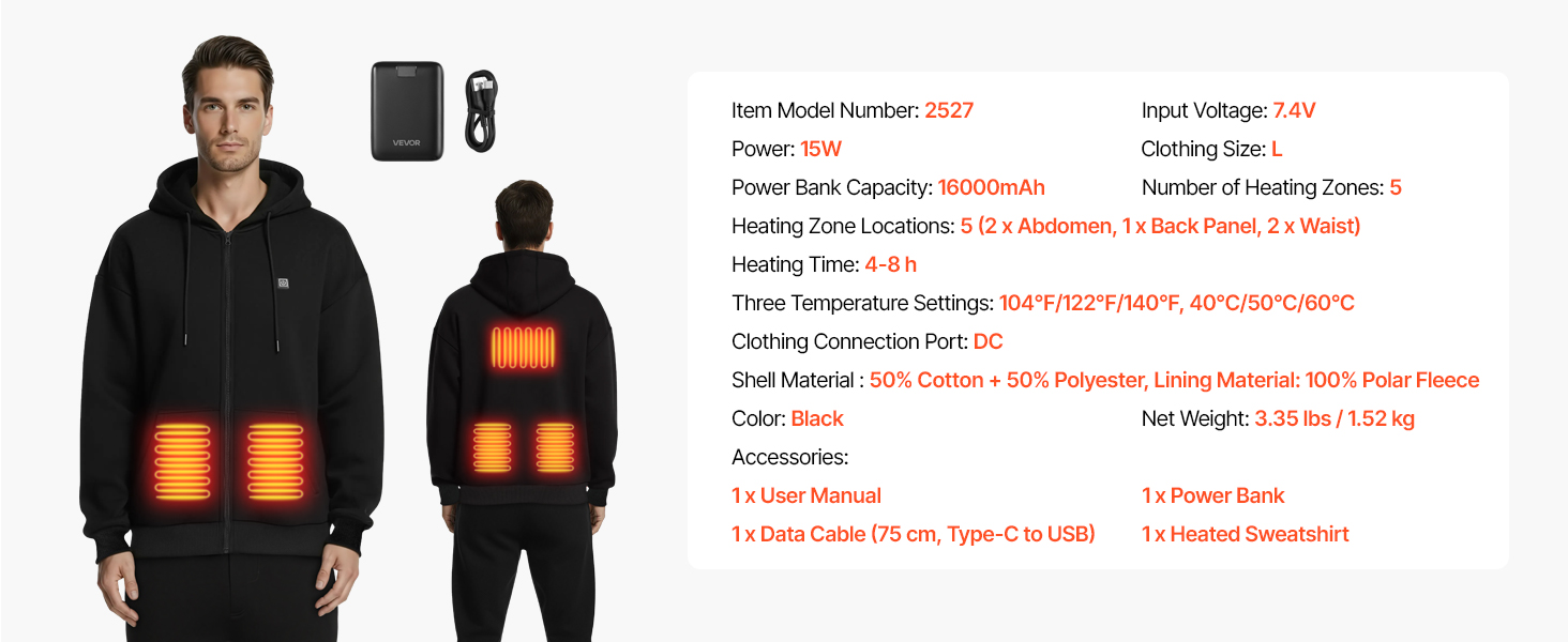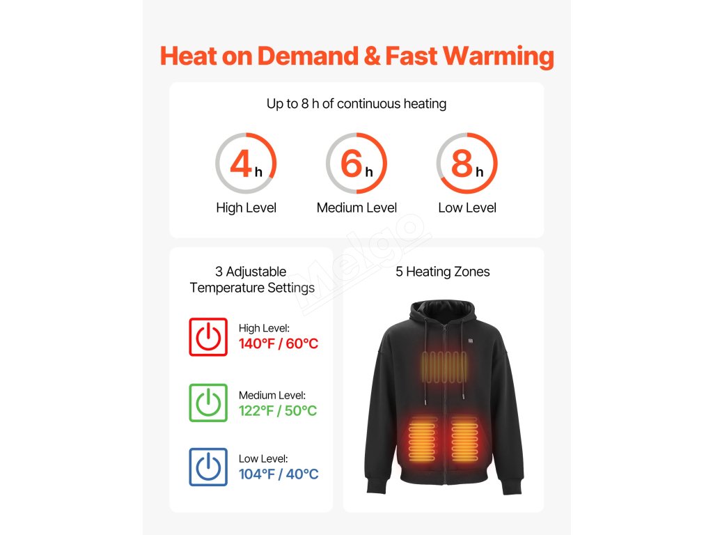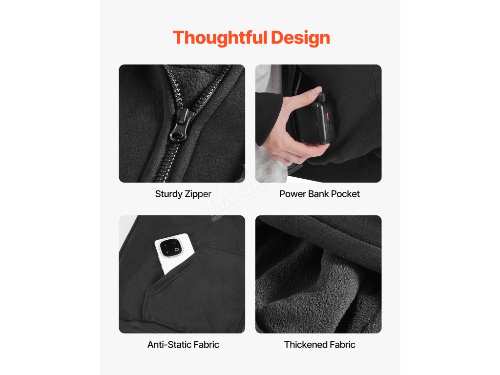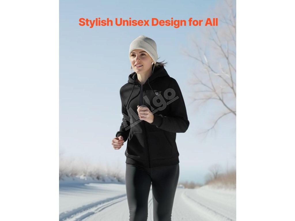 Táto vyhrievaná mikina má 5-zónové vyhrievanie z uhlíkových vlákien pre rýchle a rovnomerné teplo. Podporuje tri nastaviteľné stupne teploty s rýchlonabíjacou powerbankou s kapacitou 16 000 mAh. Je vyrobená z prvotriednej tkaniny, poskytuje odolnosť a pohodlie pri praní v práčke na zimné nosenie.