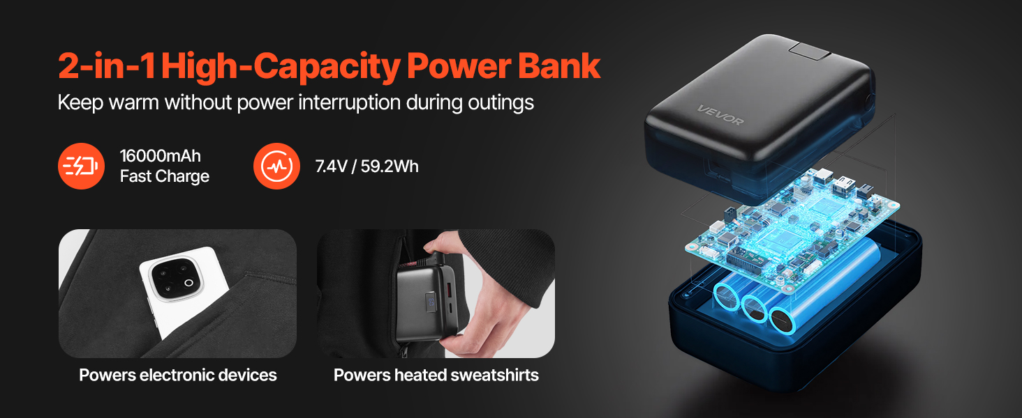 Naša vyhrievaná mikina je vybavená rýchlonabíjacou powerbankou s kapacitou 16 000 mAh, ktorá poskytuje dlhotrvajúcu výdrž batérie. S výstupom 7,4 V/15 W nielen udržiava vyhrievanú mikinu v teple, ale aj nabíja vaše elektronické zariadenia počas cestovania.