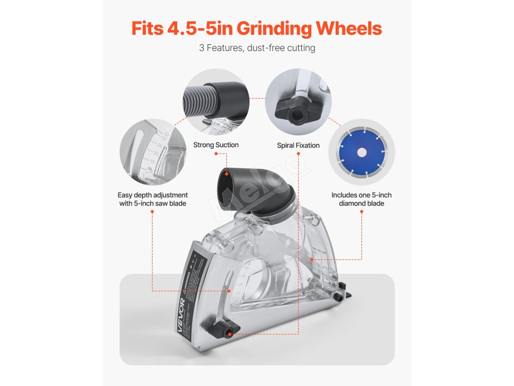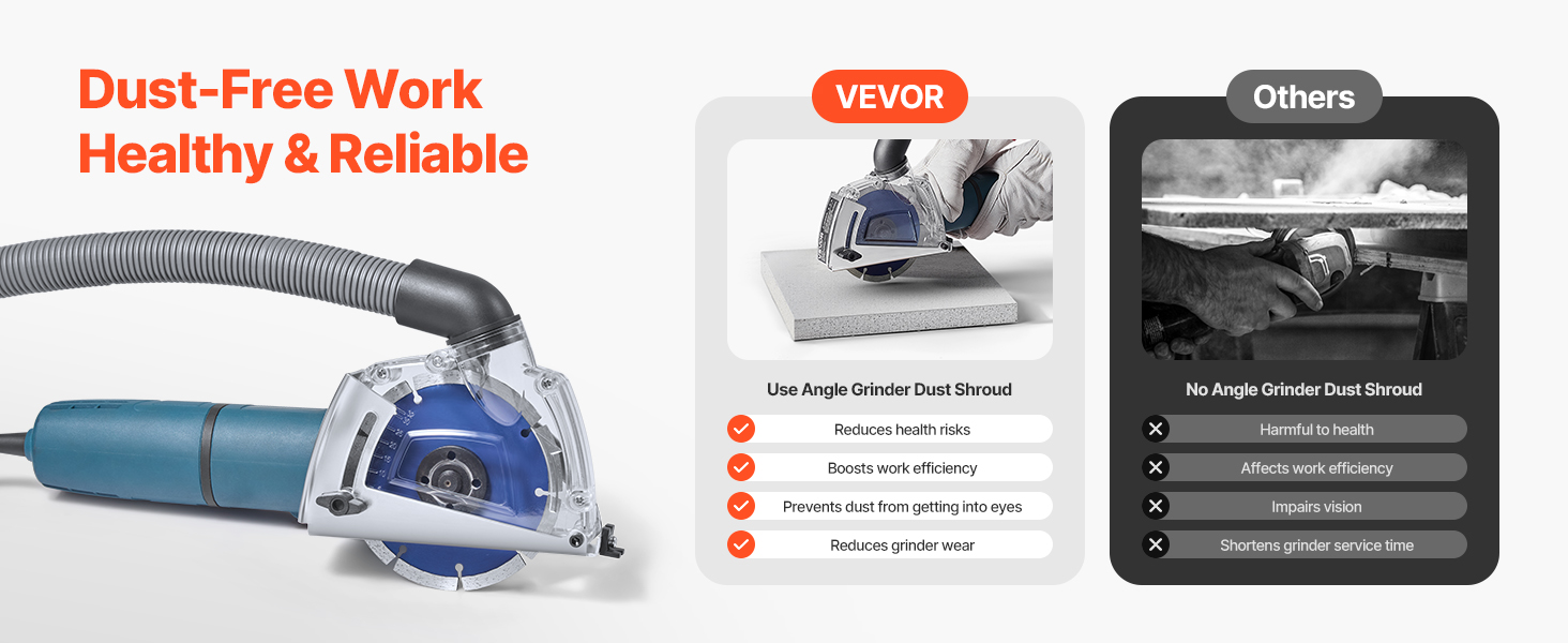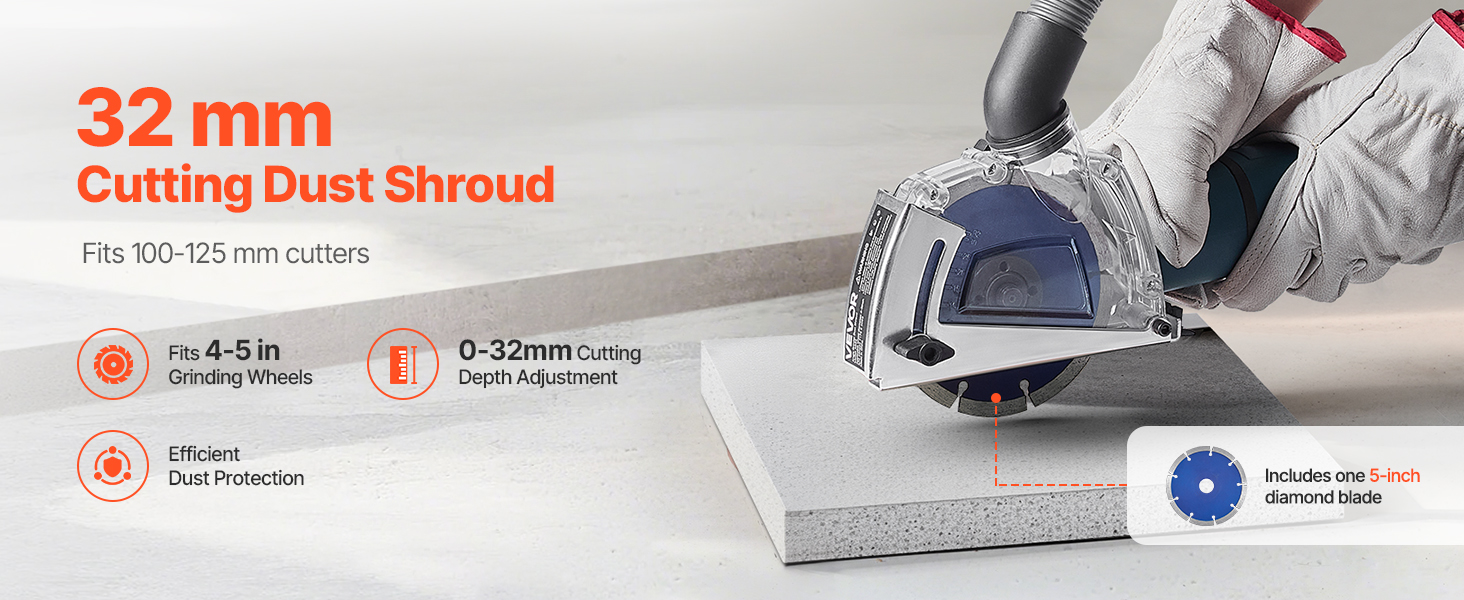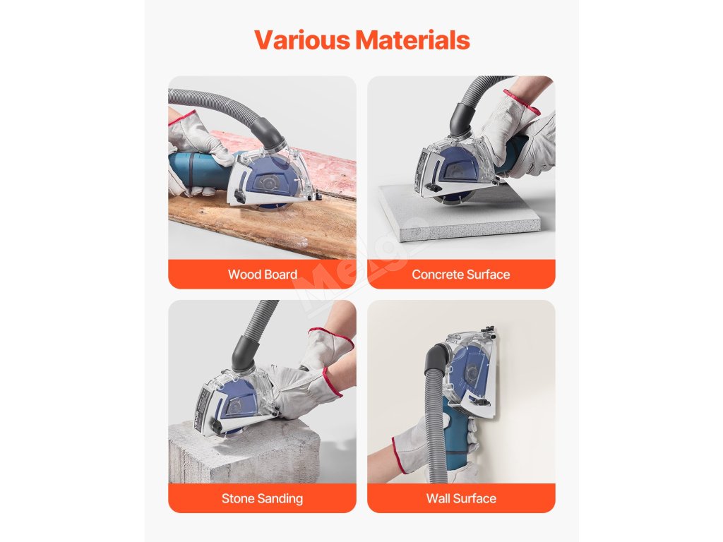 Tento protiprachový kryt uhlovej brúsky je vhodný pre rôzne rezacie stroje s nastaviteľnou hĺbkou rezania 0-32 mm. Prachový kryt brúsky sa pripája k vysávaču na výkonné odsávanie prachu, čím sa znižuje množstvo prachu a nečistôt pri brúsení materiálov, ako je mramor, betón a steny, čím sa chráni vaše zdravie.