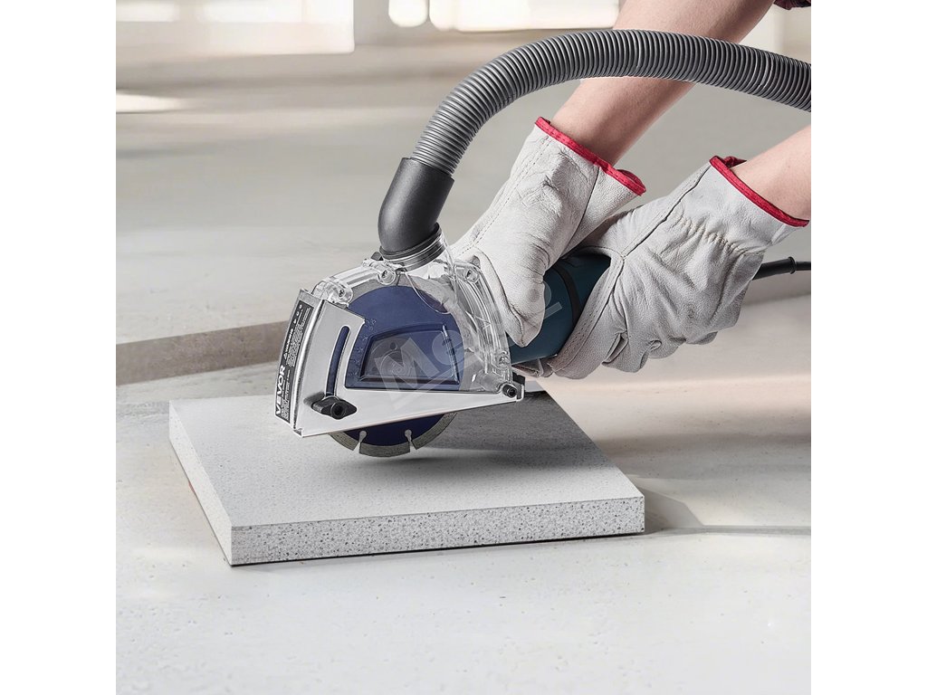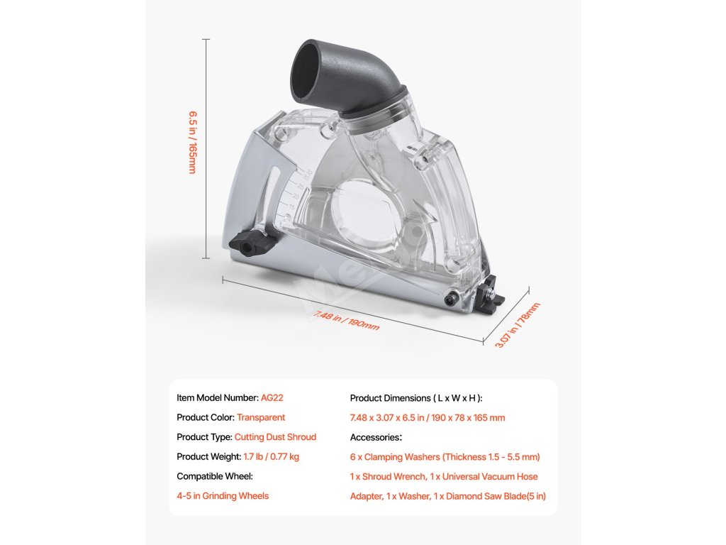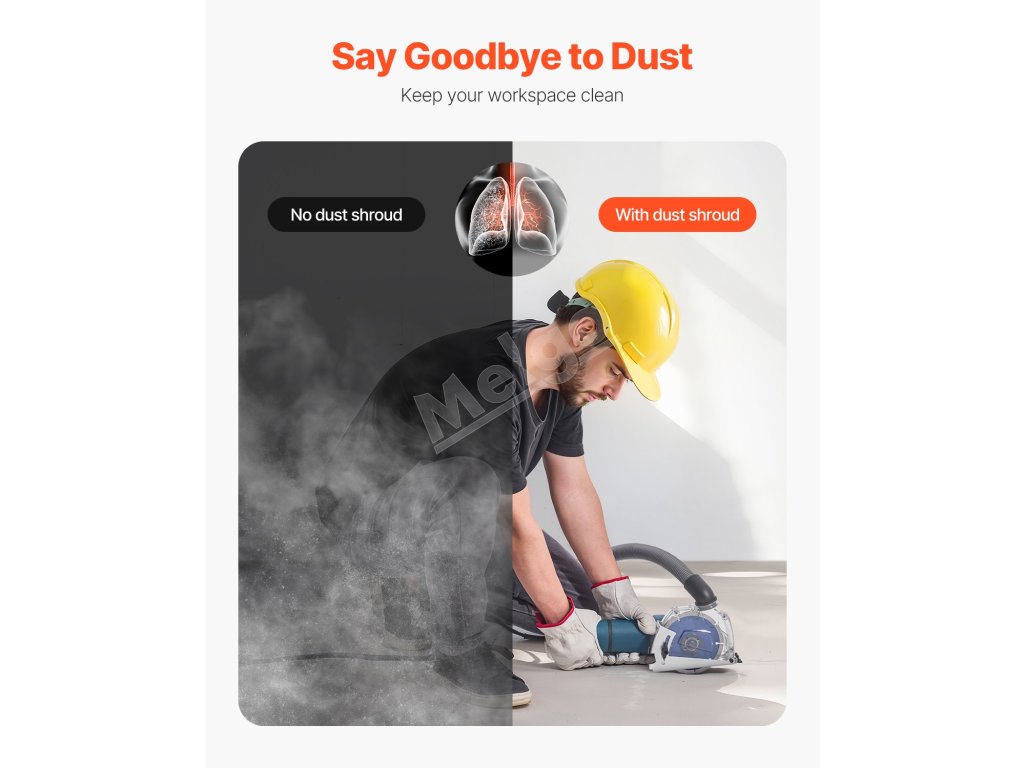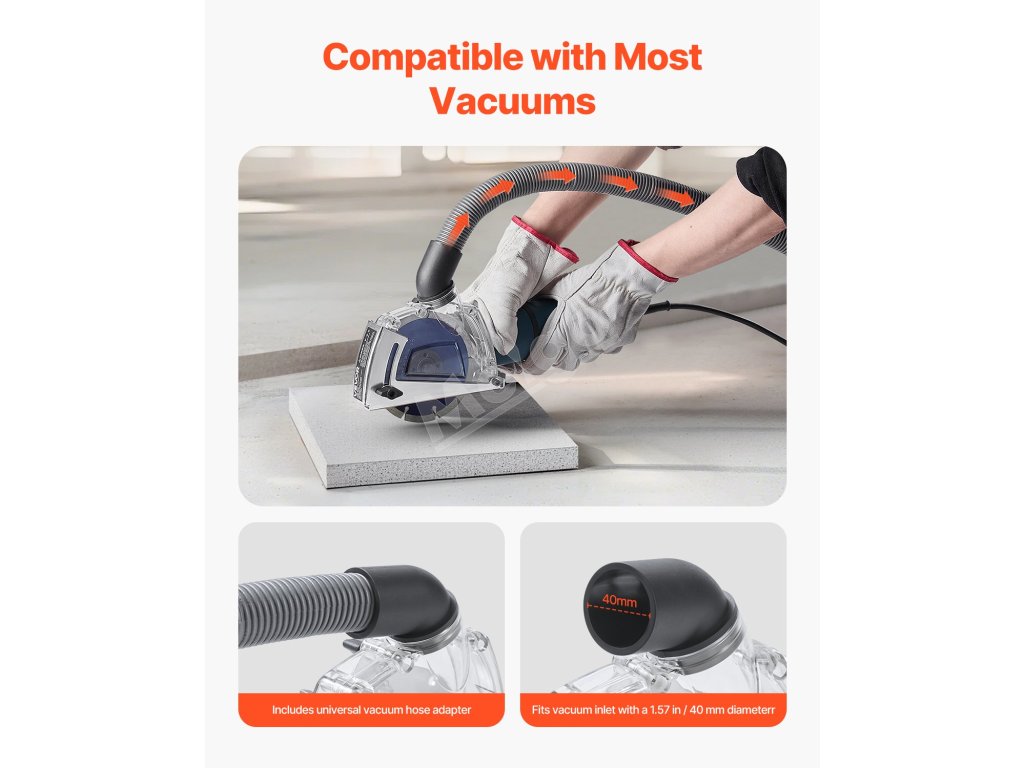 Tento protiprachový kryt uhlovej brúsky je vhodný pre rôzne rezacie stroje s nastaviteľnou hĺbkou rezania 0-32 mm. Prachový kryt brúsky sa pripája k vysávaču na výkonné odsávanie prachu, čím sa znižuje množstvo prachu a nečistôt pri brúsení materiálov, ako je mramor, betón a steny, čím sa chráni vaše zdravie.