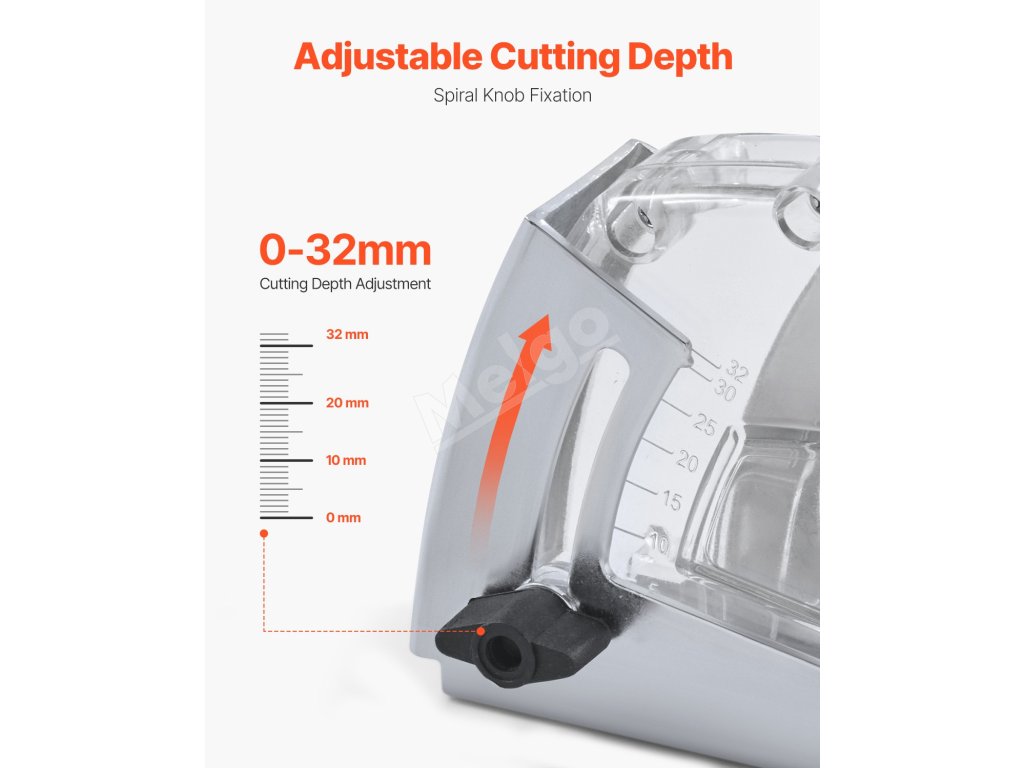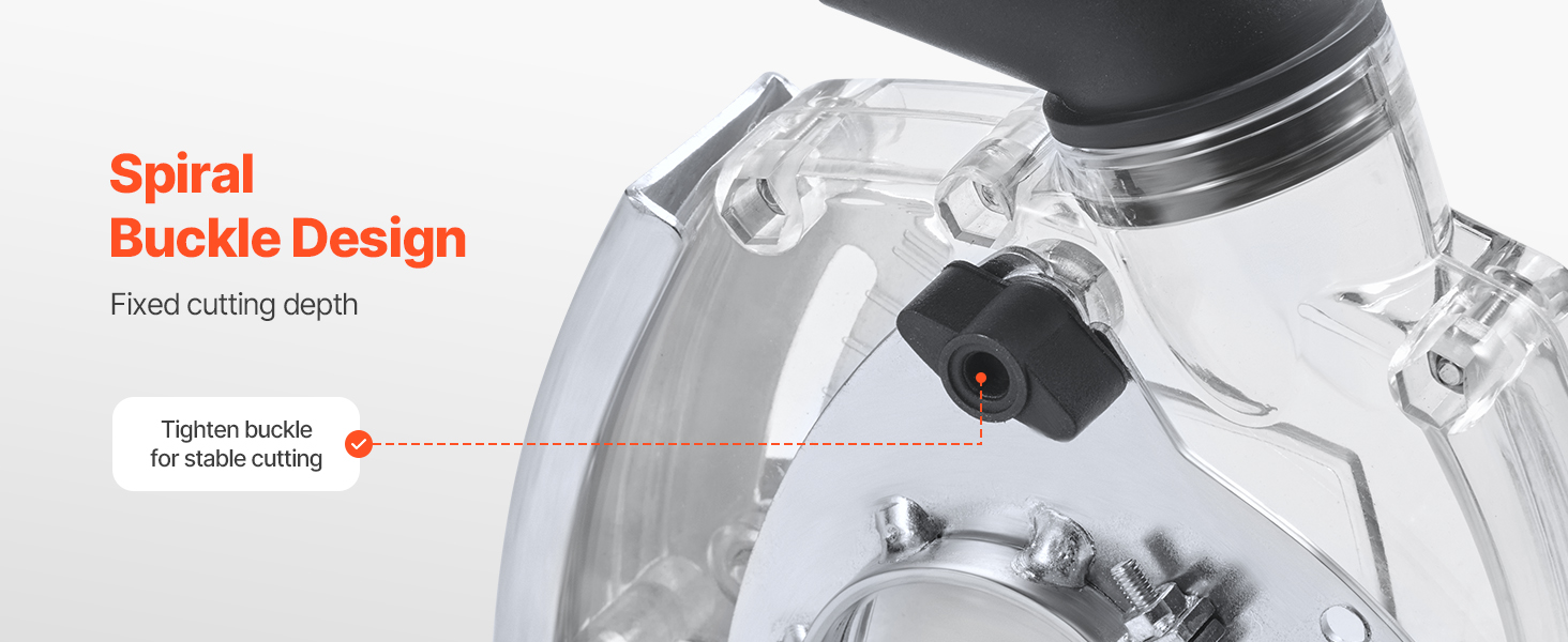 Plášť na zachytávanie prachu je vybavený špirálovým uzamykacím mechanizmom. Po nastavení požadovanej hĺbky rezu jednoducho uzamknite polohu špirály, aby ste zabránili náhodným úpravám počas prevádzky, čím zabezpečíte stabilnejší rez.