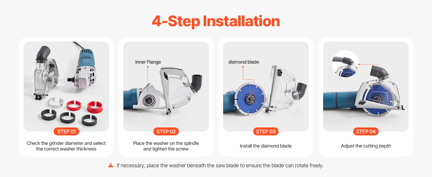 Náš protiprachový kryt brúsky je kompatibilný s väčšinou predných krytov uhlových brúsok s priemerom 1,5-2,01 palca. Šesť upínacích podložiek má rozsah hrúbky 0,06-0,22in, čo umožňuje flexibilnú a presnú kompatibilitu s rôznymi rezacími strojmi.