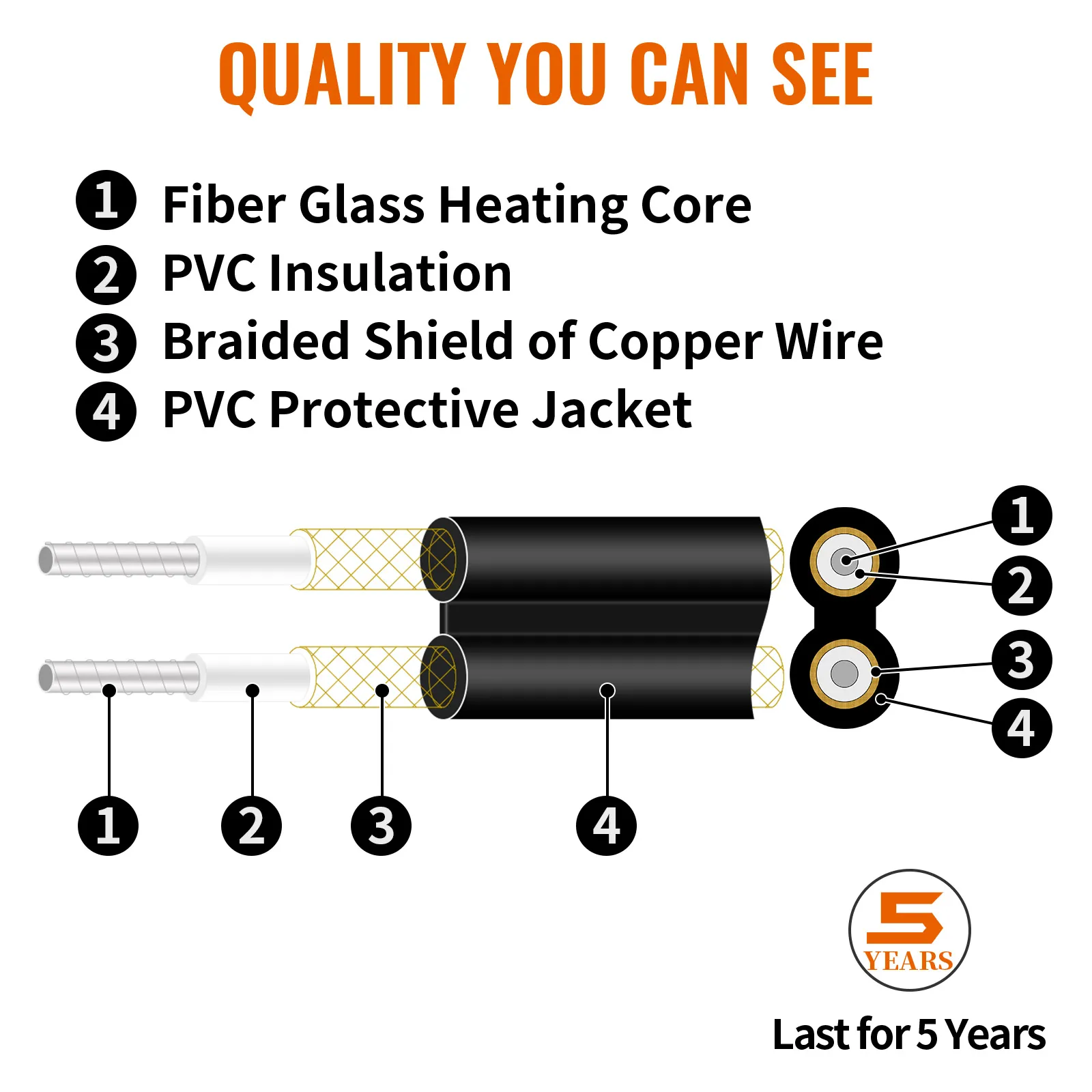 Náš kábel na ohrev potrubia je navrhnutý tak, aby zabránil zamrznutiu a praskaniu vodovodného potrubia, najmä v nepriaznivom počasí. Vhodný pre vodou plnené PEX, PVC hadice; medené, pozinkované, mosadzné potrubia s rozmermi 3/8"~1 1/2". V zime sa nemusíte obávať o vodu.