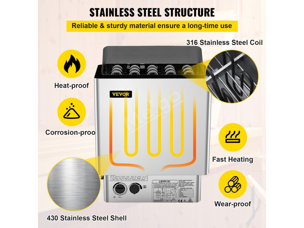 Saunový ohrievač navrhnutý s vynikajúcou oceľovou konštrukciou, ktorá zaručuje odolnosť a odolnosť proti korózii, sa môže dlhodobo používať v miestnosti s mokrou saunou.