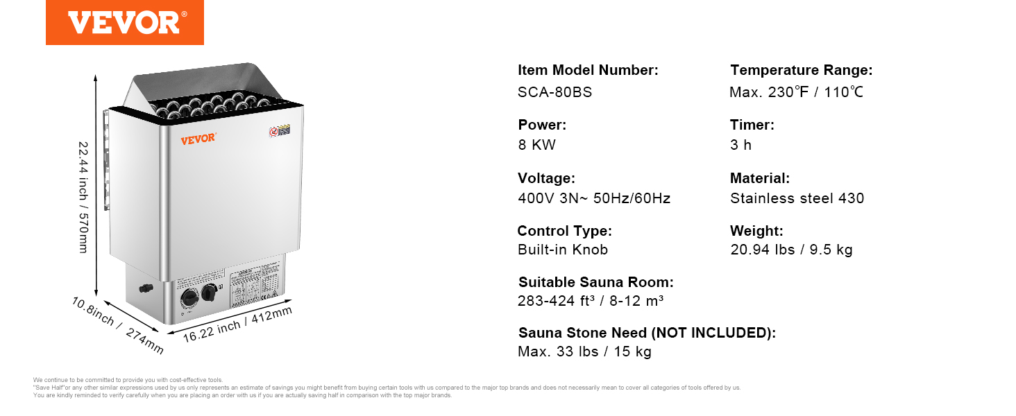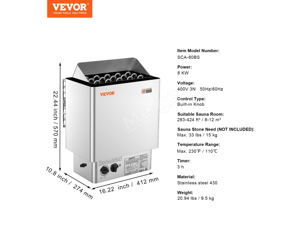 Elektrický piec do sauny 8 kW 400V 3N s časovačom 3h 8–12 m³ nerez 430