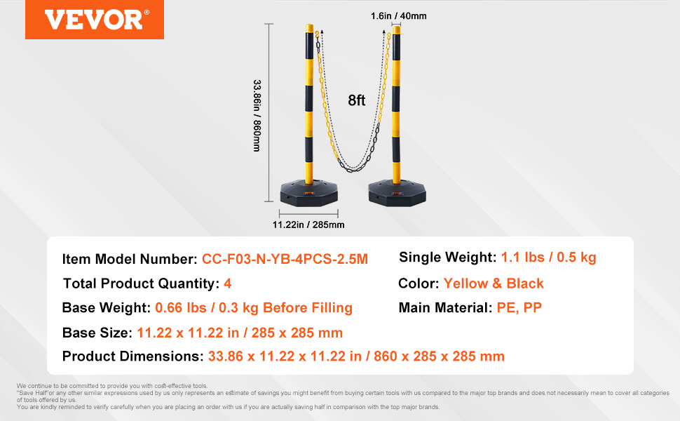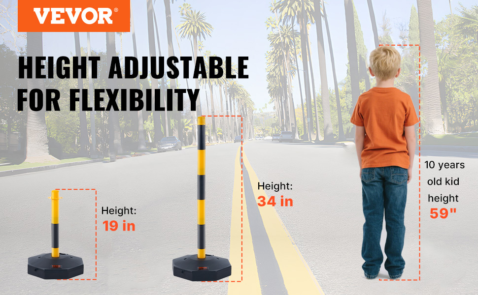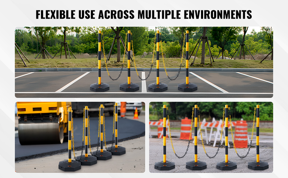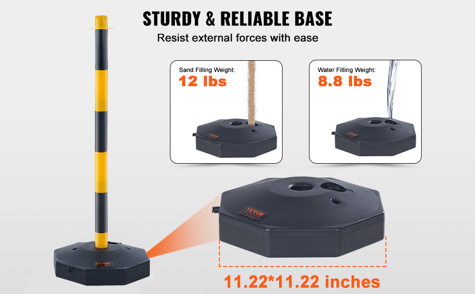 Naše dopravné vymedzovacie stĺpiky majú pevnú základňu s rozmermi 11,22 x 11,22 palca, ktorá je navrhnutá pre stabilitu, ktorá odolá skúške času. Hmotnosť stĺpikov si môžete prispôsobiť vďaka možnosti naplniť ich vodou (8,8 kg) alebo pieskom (12 kg).