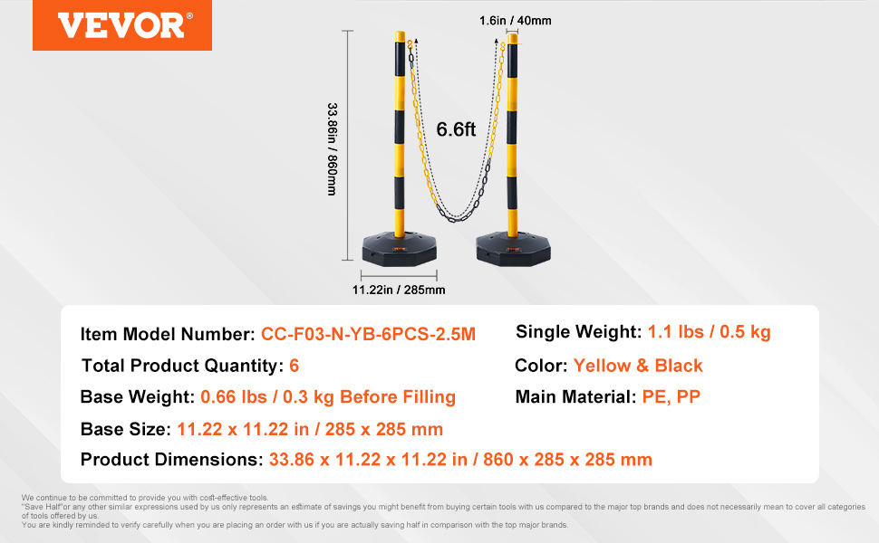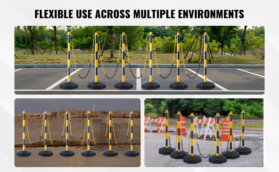 Naše dopravné vymedzovacie stĺpiky majú pevnú základňu s rozmermi 11,22 x 11,22 palca, ktorá je navrhnutá pre stabilitu, ktorá odolá skúške času. Hmotnosť stĺpikov si môžete prispôsobiť vďaka možnosti naplniť ich vodou (8,8 kg) alebo pieskom (12 kg).
