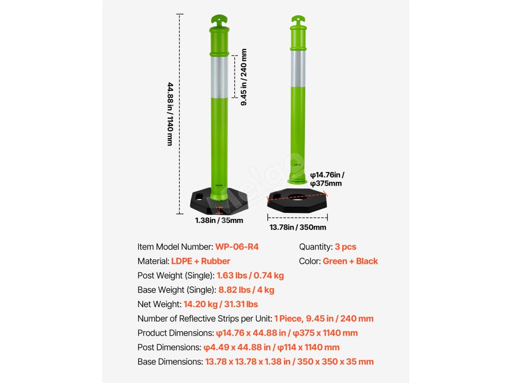 Delineačné stĺpiky 3 ks 1140 mm, ťažká základňa, reflexné pásy, zelené