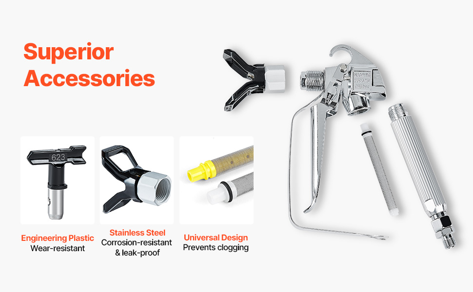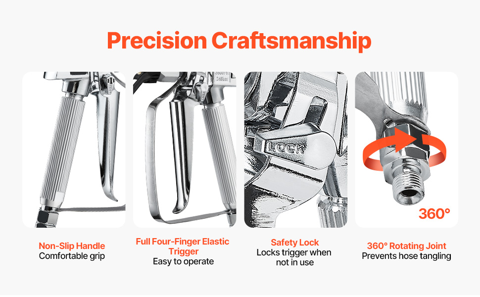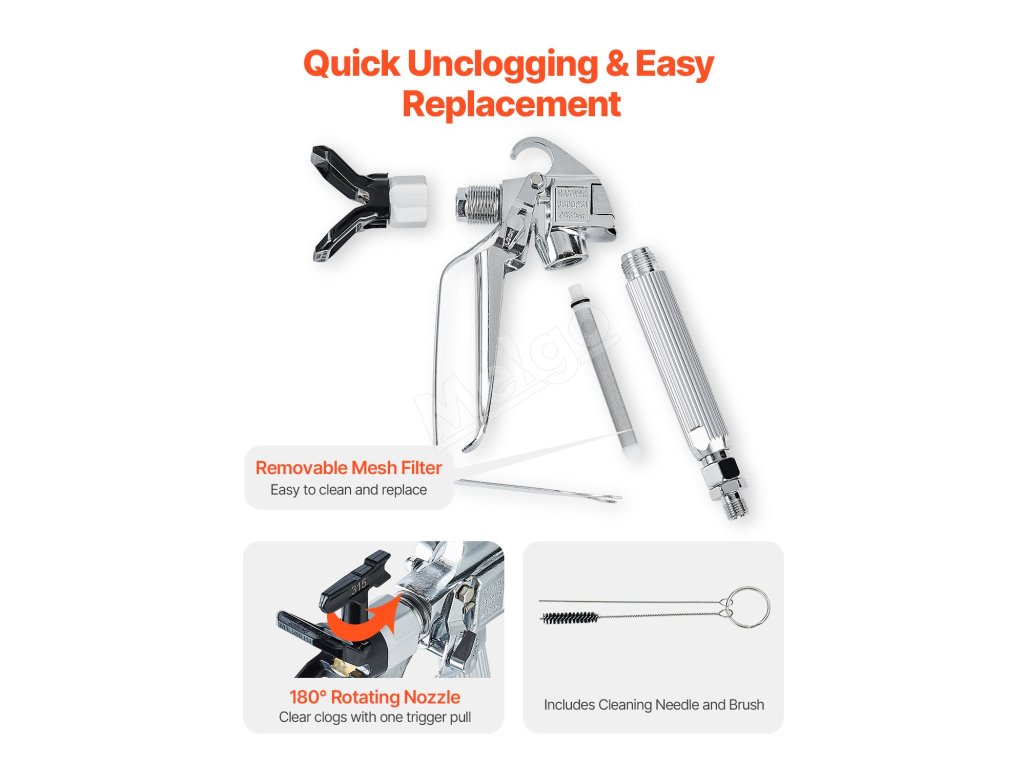 Každý detail súpravy bezvzduchovej striekacej pištole je premyslene navrhnutý tak, aby zlepšil celkový výkon a používateľský komfort a zabezpečil praktickosť a bezpečnosť pri všetkých aplikáciách.