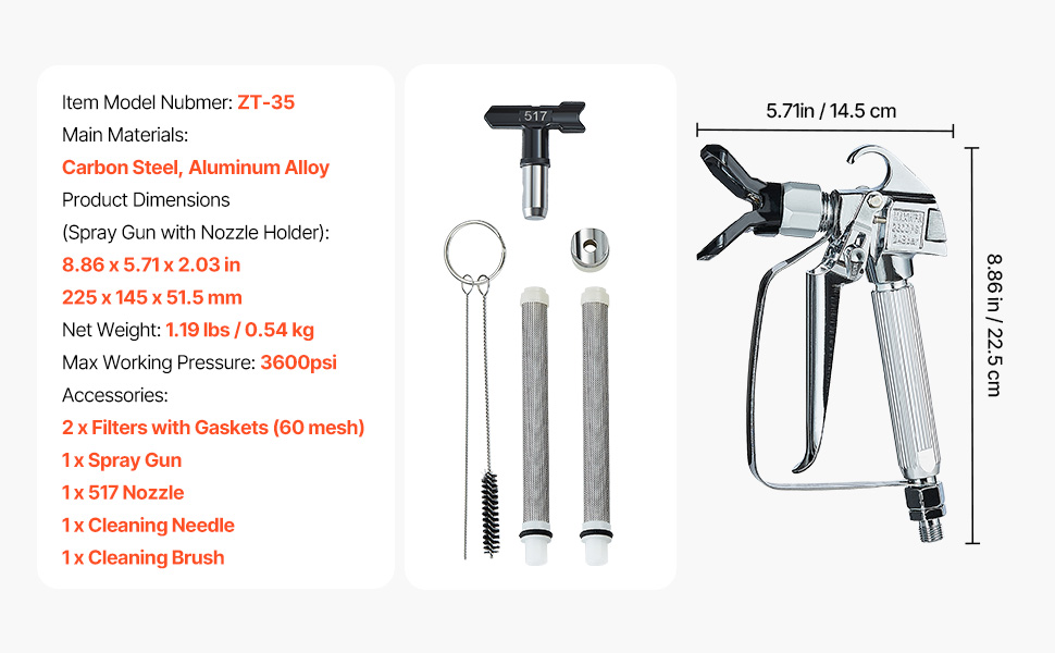 | Rozmery výrobku (striekacia pištoľ s držiakom trysky) | 8.86 x 5,71 x 2,03 in / 225 x 145 x 51,5 mm |