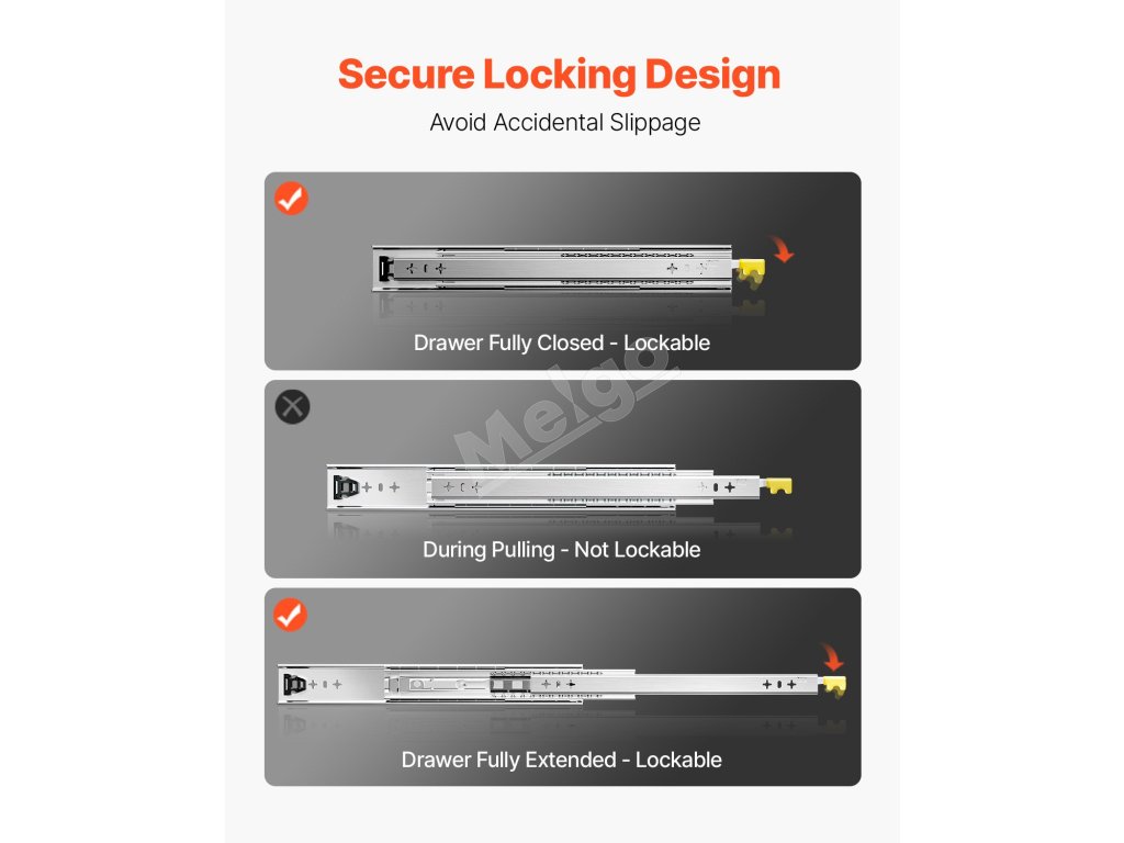 Tieto zásuvkové koľajnice vyrobené z vysokokvalitnej ocele majú vysokú tvrdosť, veľkú stabilitu a odolnosť. Fungujú so správnym uložením a nízkou hlučnosťou. Dodávajú sa s podrobnými vodidlami a praktickými skrutkami. Je ideálna na skladovanie v skrinkách, priemyselných zásuvkách, komerčnom vybavení, upravených vozidlách atď.