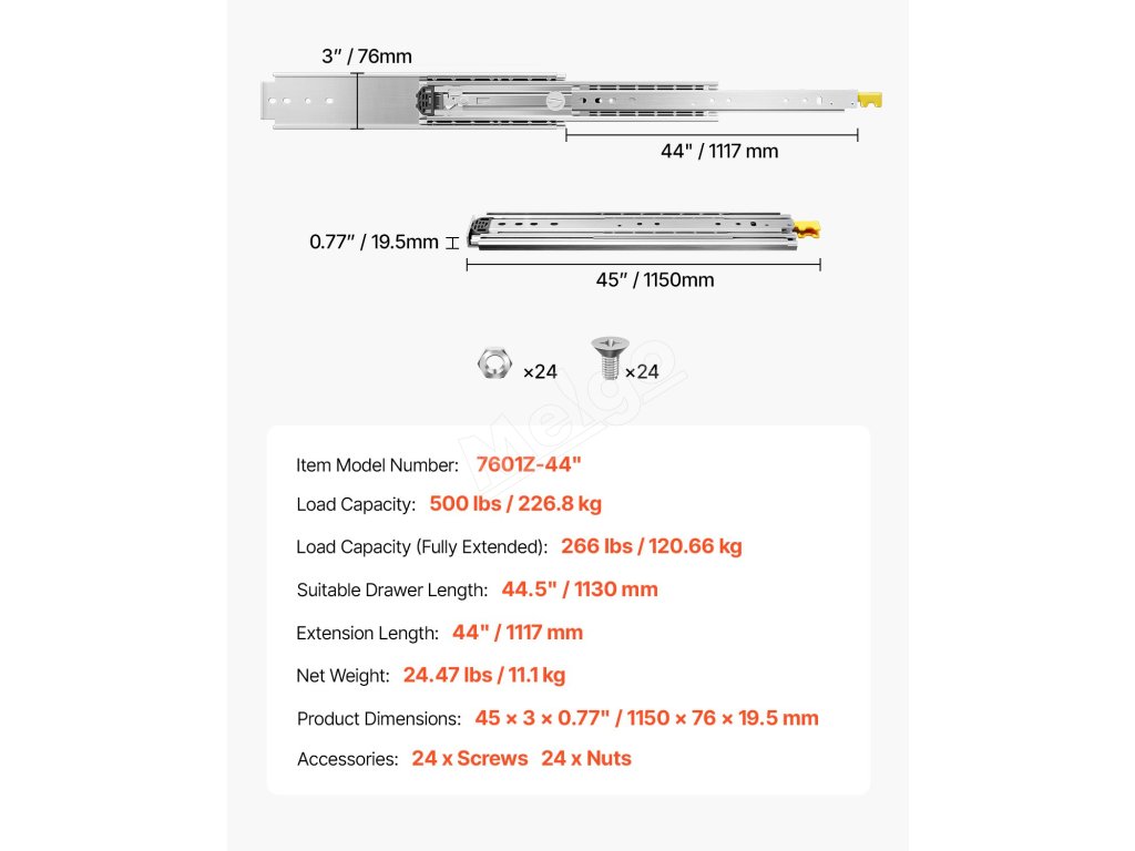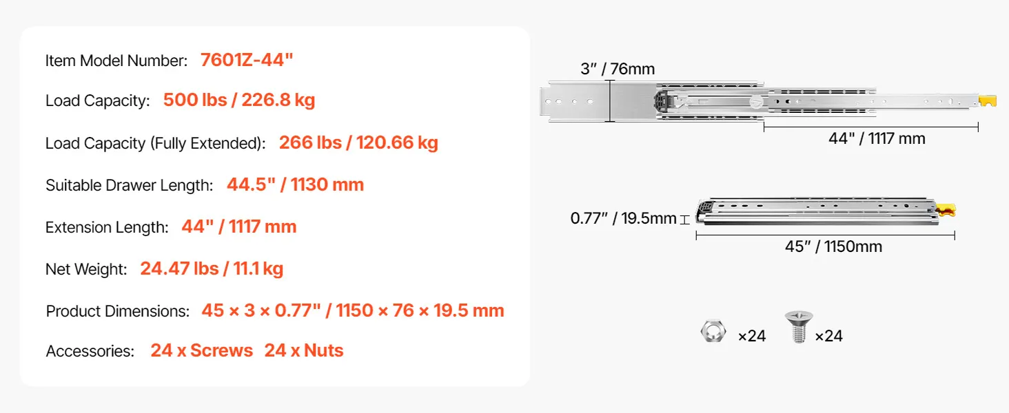 | Dĺžka výsuvu | 44" / 1117 mm |