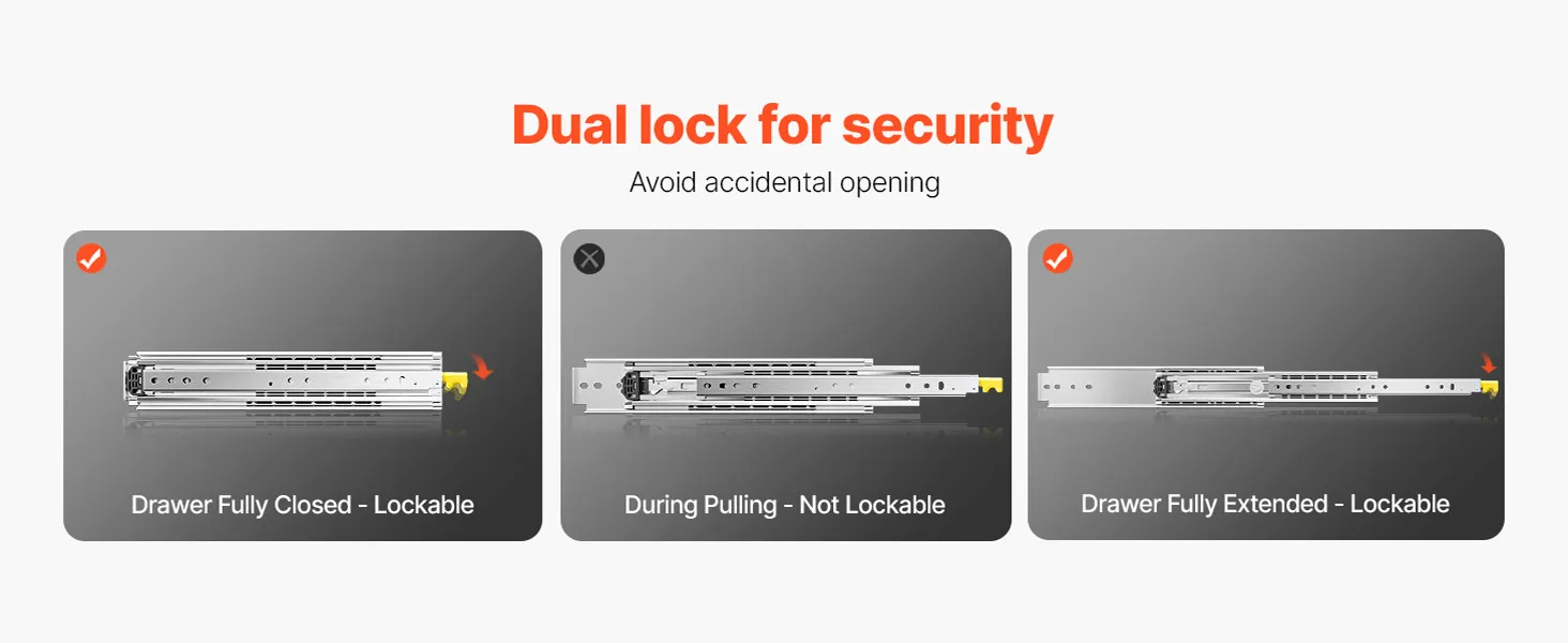 Tieto zásuvkové koľajnice vyrobené z vysokokvalitnej ocele majú vysokú tvrdosť, veľkú stabilitu a odolnosť. Fungujú so správnym uložením a nízkou hlučnosťou. Dodávajú sa s podrobnými vodidlami a praktickými skrutkami. Je ideálna na skladovanie v skrinkách, priemyselných zásuvkách, komerčnom vybavení, upravených vozidlách atď.