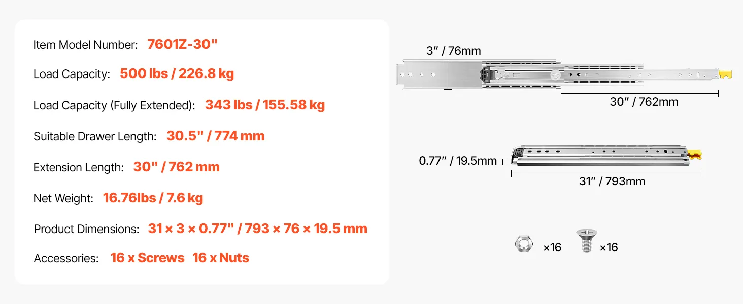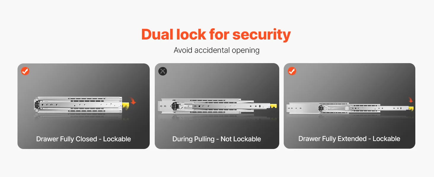 Tieto zásuvkové koľajnice vyrobené z vysokokvalitnej ocele majú vysokú tvrdosť, veľkú stabilitu a odolnosť. Fungujú so správnym uložením a nízkou hlučnosťou. Dodávajú sa s podrobnými vodidlami a praktickými skrutkami. Je ideálna na skladovanie v skrinkách, priemyselných zásuvkách, komerčnom vybavení, upravených vozidlách atď.