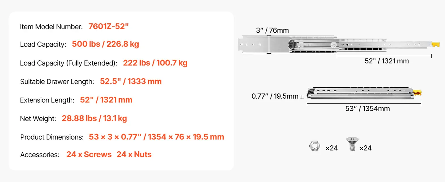 | Dĺžka výsuvu | 52" / 1321 mm |