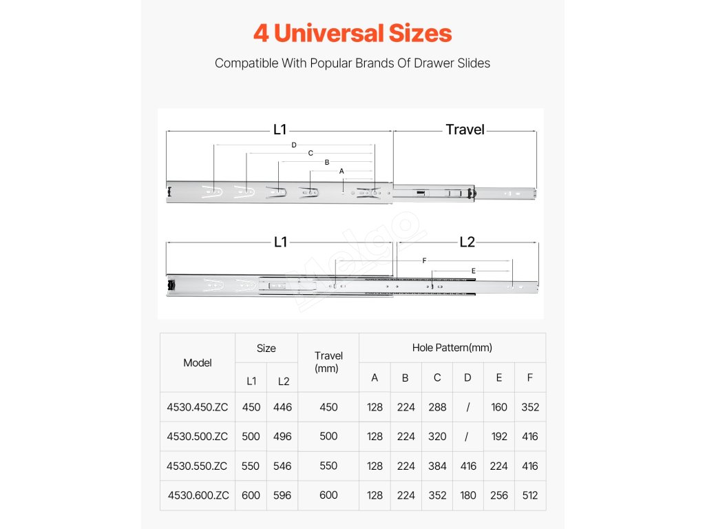 Tieto výsuvy s vynikajúcou nosnosťou 100 libier zaručujú spoľahlivé skladovanie. Sú vyrobené z pozinkovanej ocele s hrúbkou 1,2 mm, vyznačujú sa hladkou a tichou prevádzkou, plným trojstupňovým výsuvom a kĺzaním bez námahy, čím ponúkajú dokonalú kombináciu vynikajúcej kvality a jednoduchého používania.