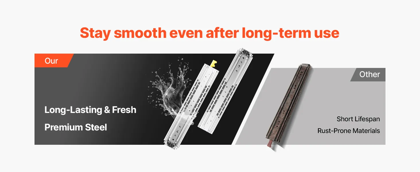 Vďaka nosnosti 500 libier je tento zásuvkový výsuv vyrobený z vysokokvalitnej ocele, je odolný voči korózii a korózii a je skonštruovaný tak, aby vydržal, čím spĺňa všetky vaše potreby týkajúce sa nosnosti.
