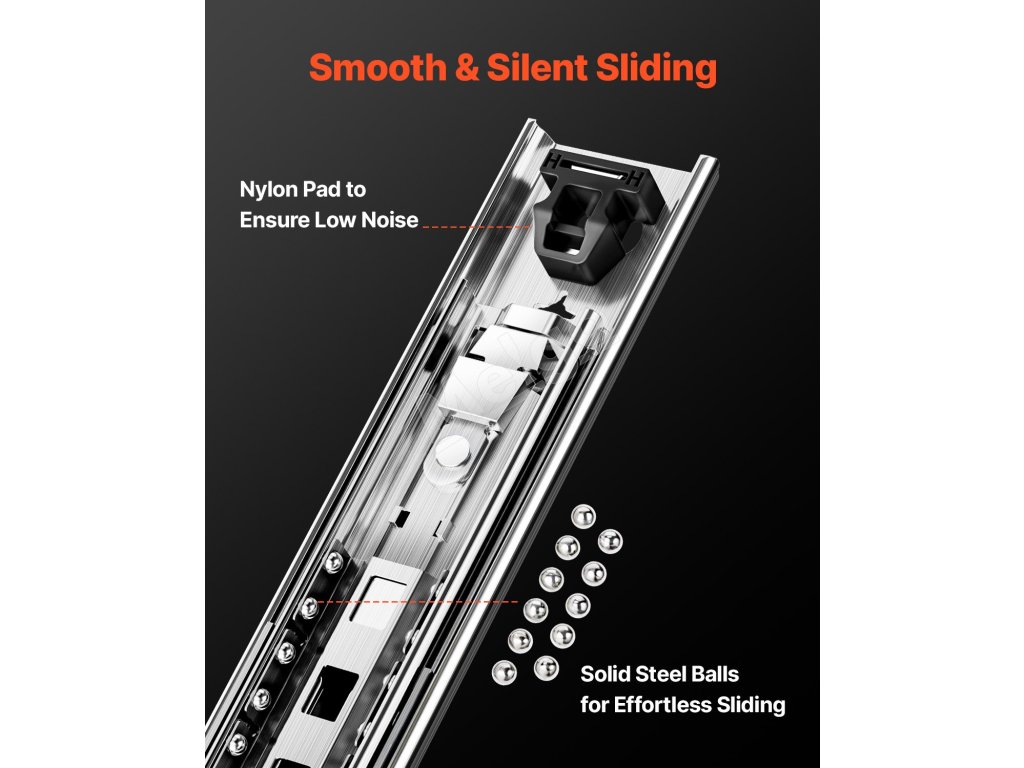 Tieto zásuvkové koľajnice vyrobené z vysokokvalitnej ocele majú vysokú tvrdosť, veľkú stabilitu a odolnosť. Fungujú so správnym uložením a nízkou hlučnosťou. Dodávajú sa s podrobnými vodidlami a praktickými skrutkami. Je ideálna na skladovanie v skrinkách, priemyselných zásuvkách, komerčnom vybavení, upravených vozidlách atď.