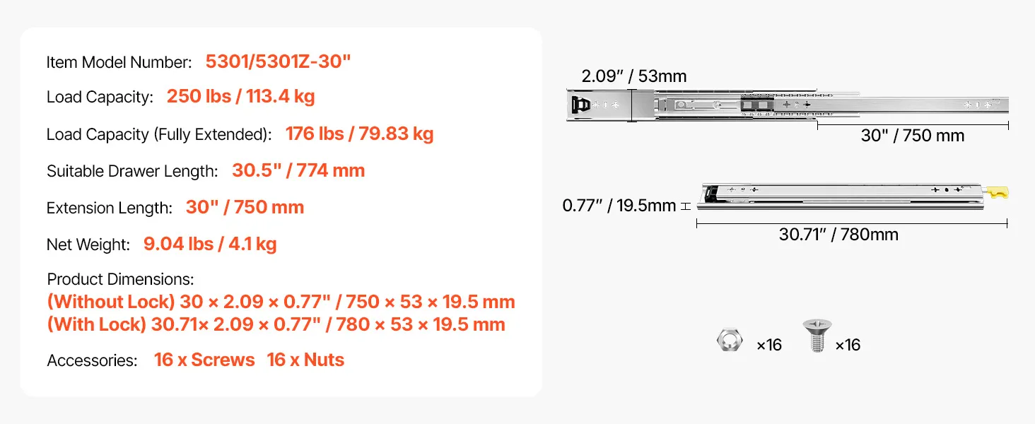 | Dĺžka výsuvu | 30" / 750 mm |
