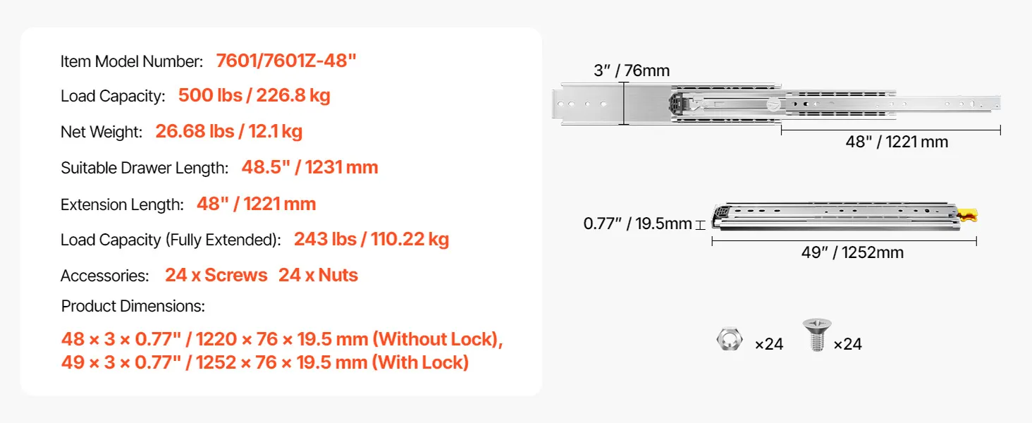 | Dĺžka výsuvu | 48" / 1221 mm |