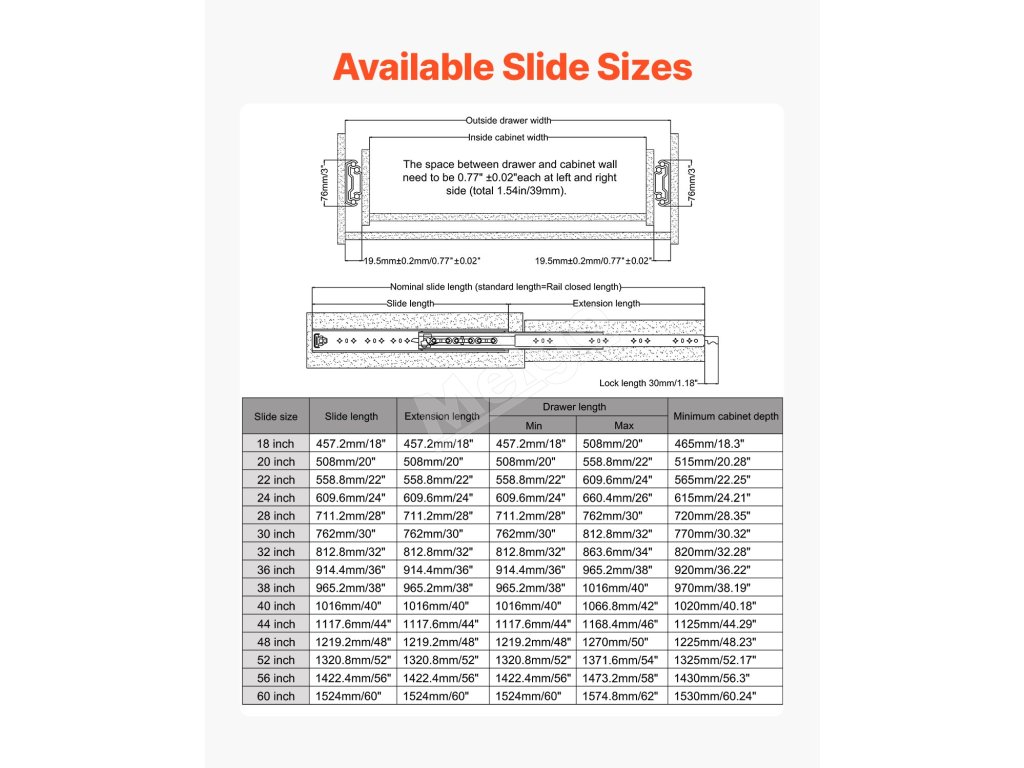 Súprava bočných guľôčkových zamykateľných výsuvov 16–60 in, 500 lbs