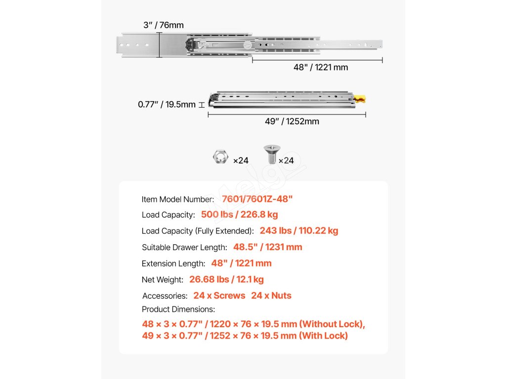 | Dĺžka výsuvu | 48" / 1221 mm |