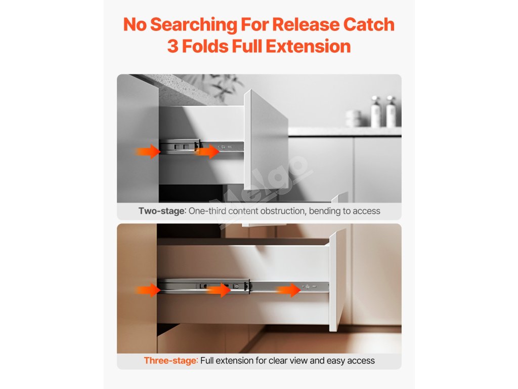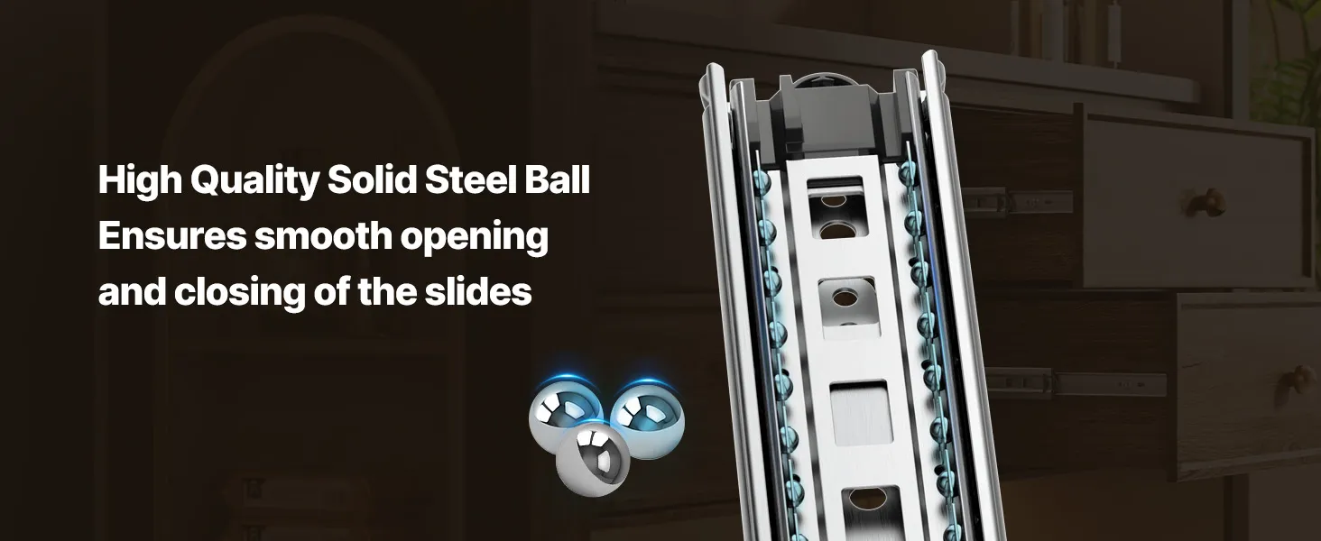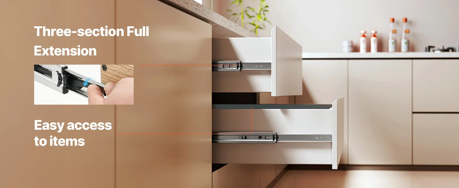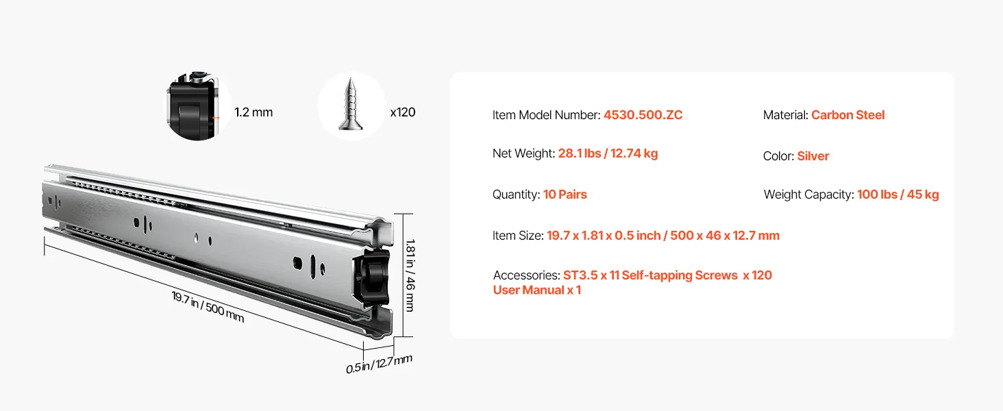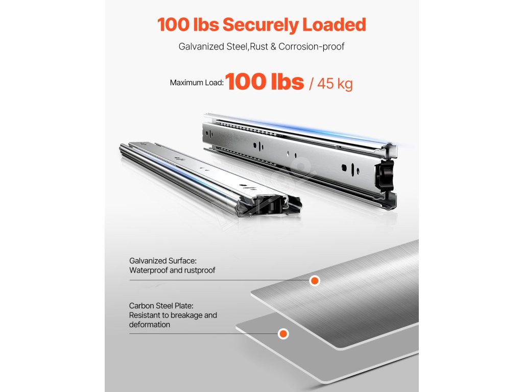 Tieto výsuvy s vynikajúcou nosnosťou 100 libier zaručujú spoľahlivé skladovanie. Sú vyrobené z pozinkovanej ocele s hrúbkou 1,2 mm, vyznačujú sa hladkou a tichou prevádzkou, plným trojstupňovým výsuvom a kĺzaním bez námahy, čím ponúkajú dokonalú kombináciu vynikajúcej kvality a jednoduchého používania.