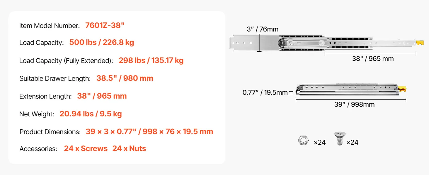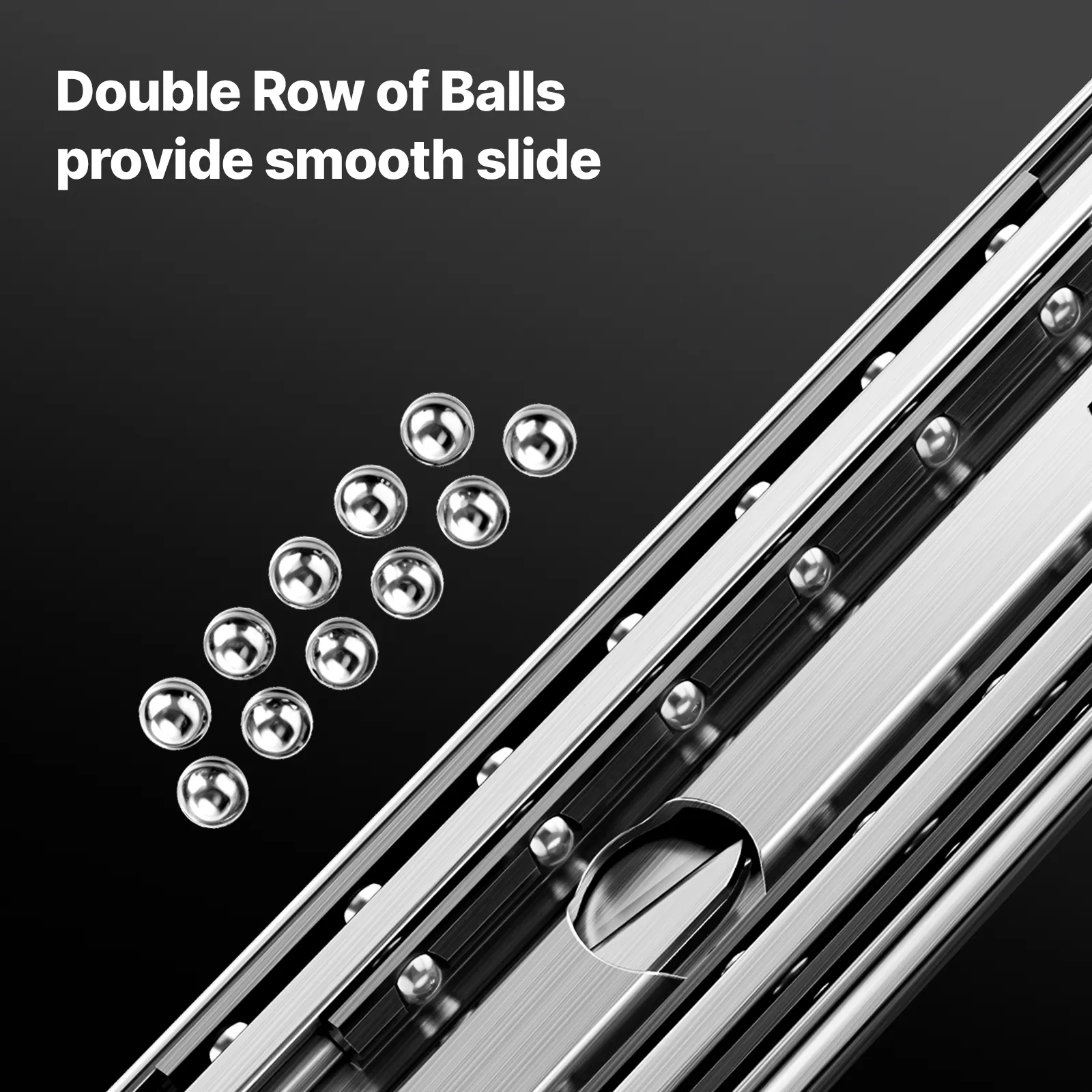 Tieto zásuvkové koľajnice vyrobené z vysokokvalitnej ocele majú vysokú tvrdosť, veľkú stabilitu a odolnosť. Fungujú so správnym uložením a nízkou hlučnosťou. Dodávajú sa s podrobnými vodidlami a praktickými skrutkami. Je ideálna na skladovanie v skrinkách, priemyselných zásuvkách, komerčnom vybavení, upravených vozidlách atď.