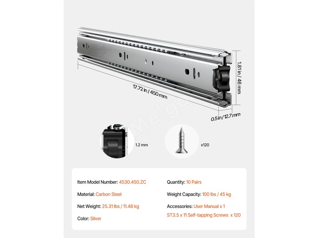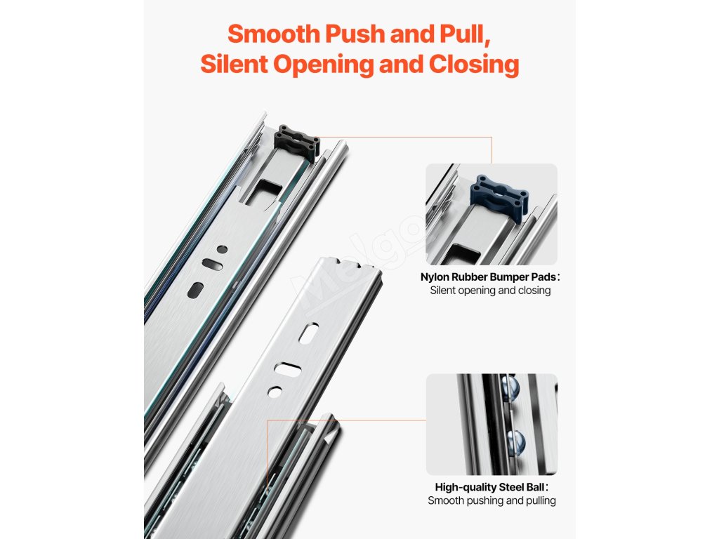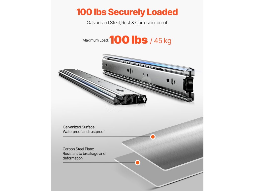 Tieto výsuvy s vynikajúcou nosnosťou 100 libier zaručujú spoľahlivé skladovanie. Sú vyrobené z pozinkovanej ocele s hrúbkou 1,2 mm, vyznačujú sa hladkou a tichou prevádzkou, plným trojstupňovým výsuvom a kĺzaním bez námahy, čím ponúkajú dokonalú kombináciu vynikajúcej kvality a jednoduchého používania.