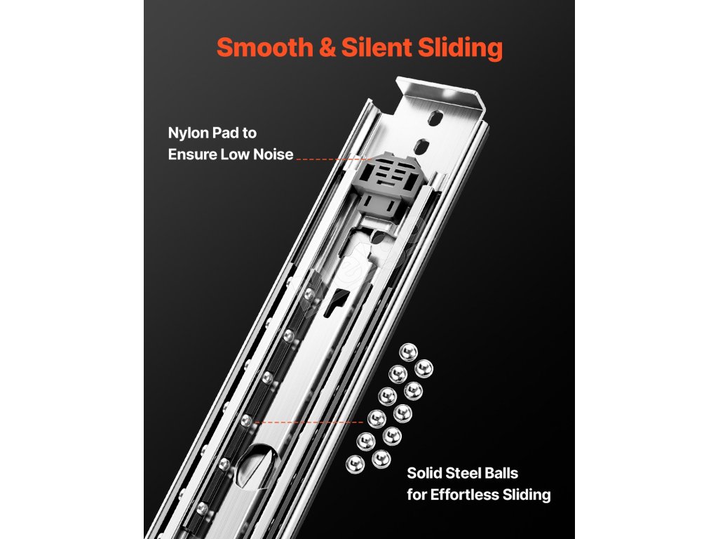 Tieto zásuvkové koľajnice vyrobené z vysokokvalitnej ocele majú vysokú tvrdosť, veľkú stabilitu a odolnosť. Fungujú so správnym uložením a nízkou hlučnosťou. Dodávajú sa s podrobnými vodidlami a praktickými skrutkami. Je ideálna na skladovanie v skrinkách, priemyselných zásuvkách, komerčnom vybavení, upravených vozidlách atď.