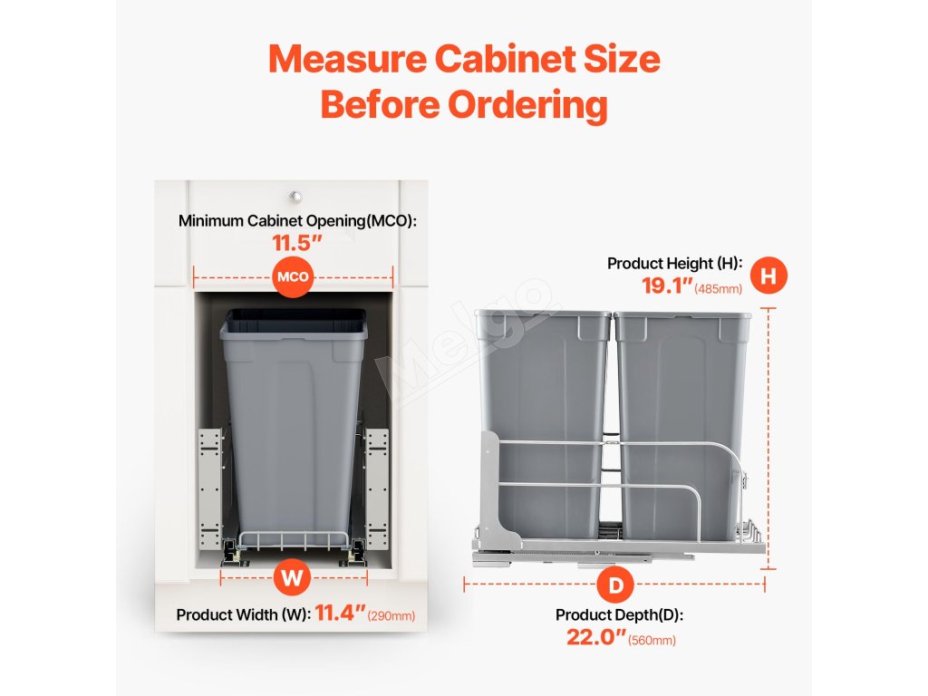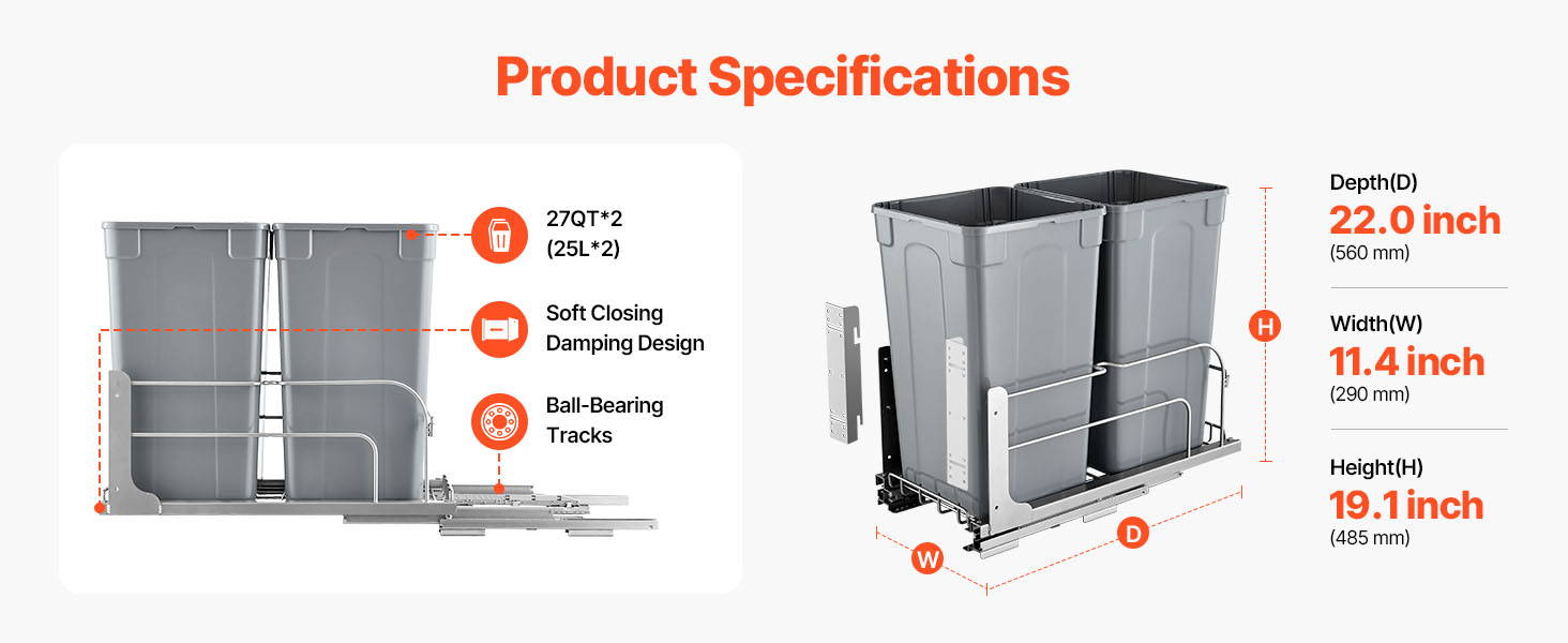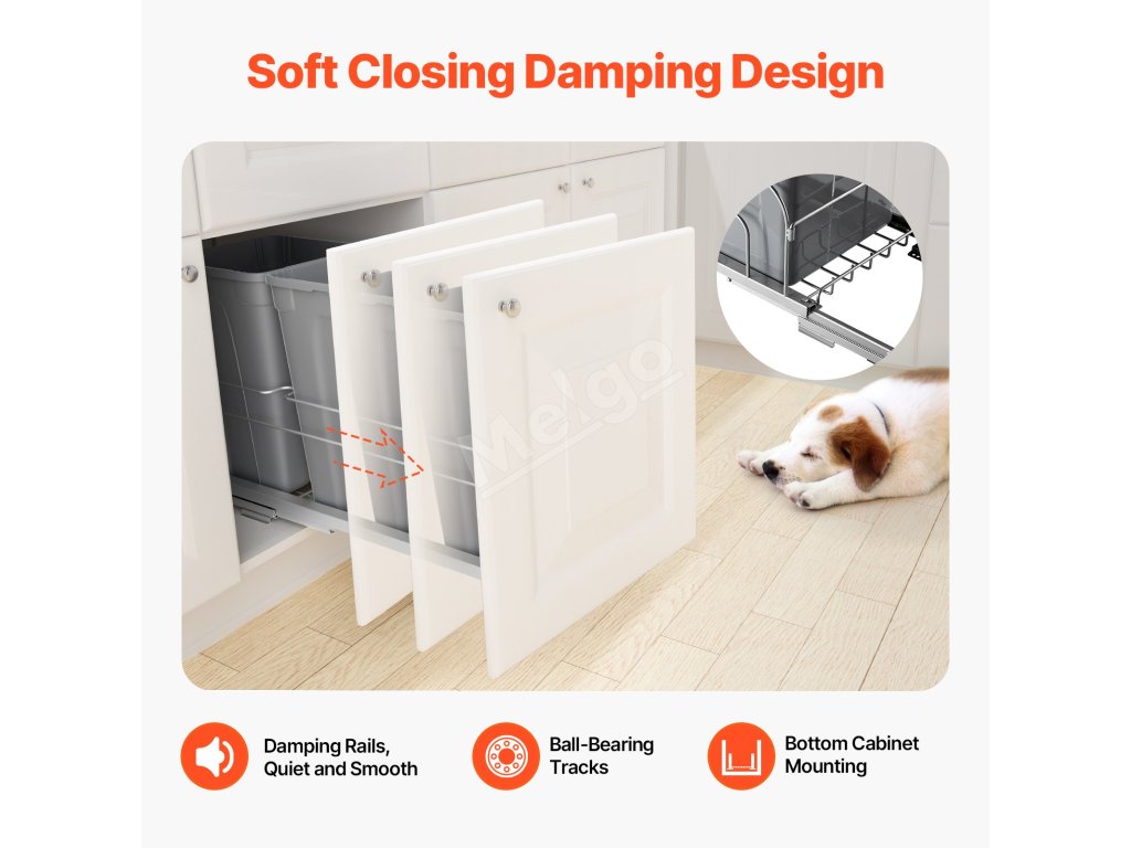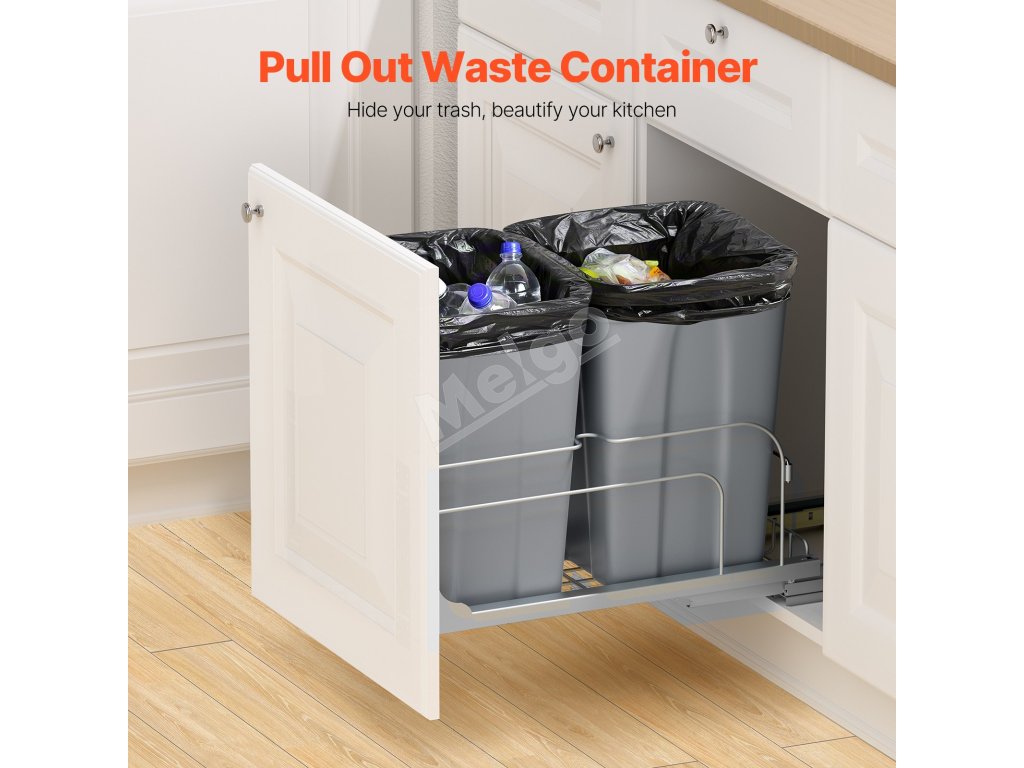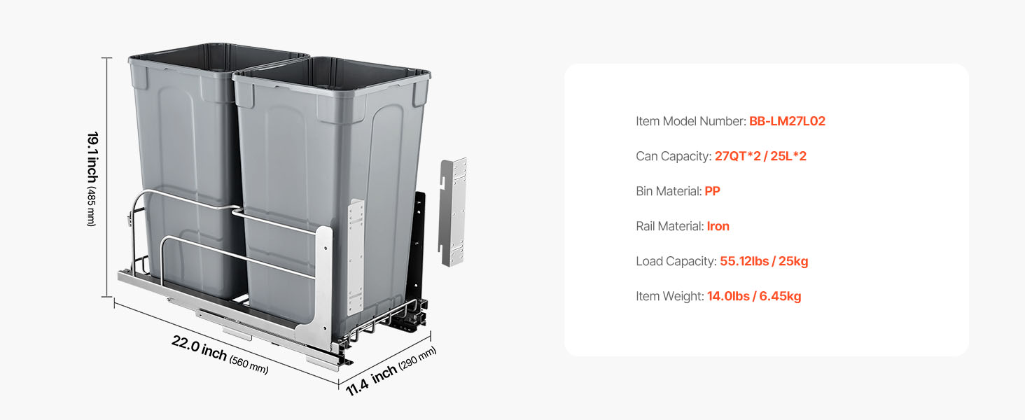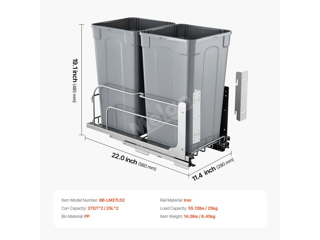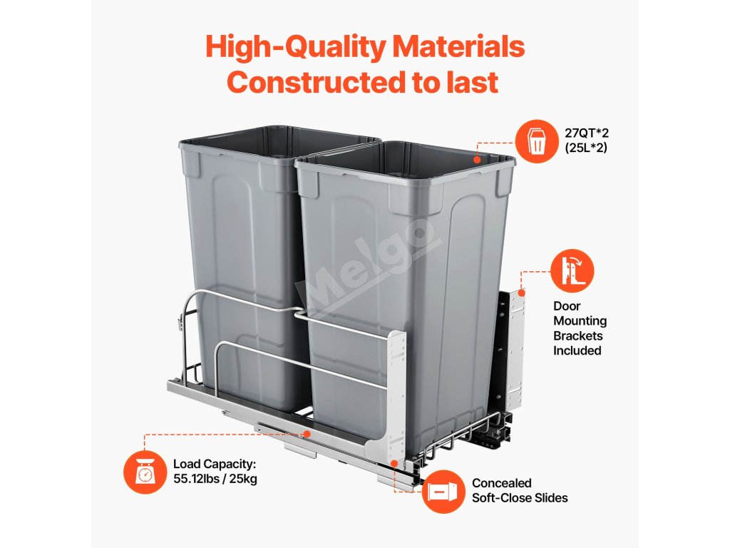 veľká kapacita 27QT+27QT na maximalizáciu priestoru v kuchyni. Odpadkový kôš pod kuchynskú linku pojme až 66 lbs / 30 kg odpadu.