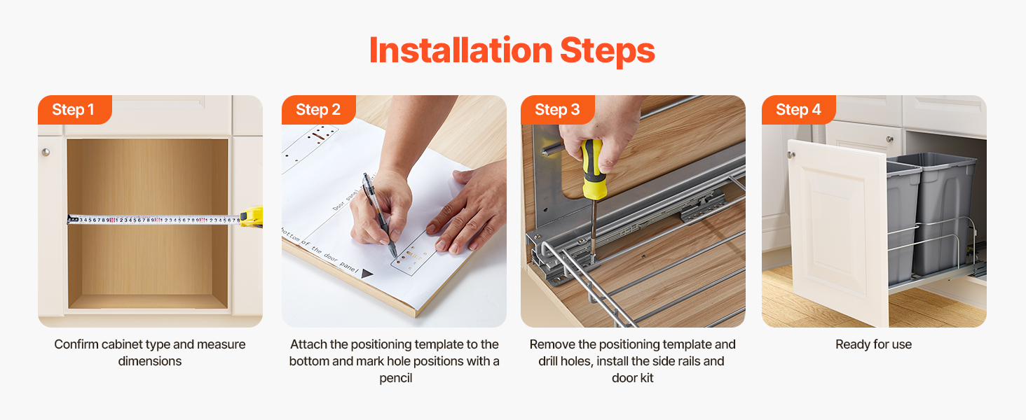 Výsuvnú nádobu na odpadky ľahko nainštalujete za niekoľko minút. Pomocou priložených montážnych otvorov a skrutiek ho možno rýchlo namontovať na vašu skrinku. Dodáva sa s dverovou súpravou na inštaláciu na dvere skrinky, vďaka čomu je vysúvanie odpadkového koša pohodlné.