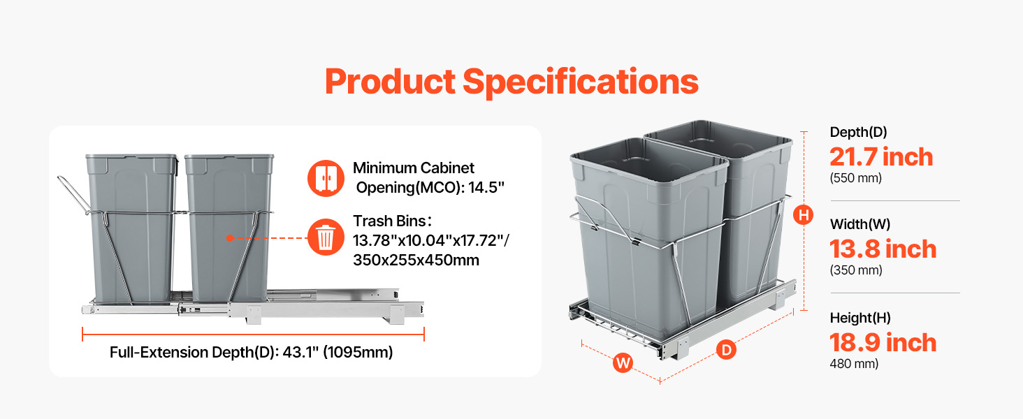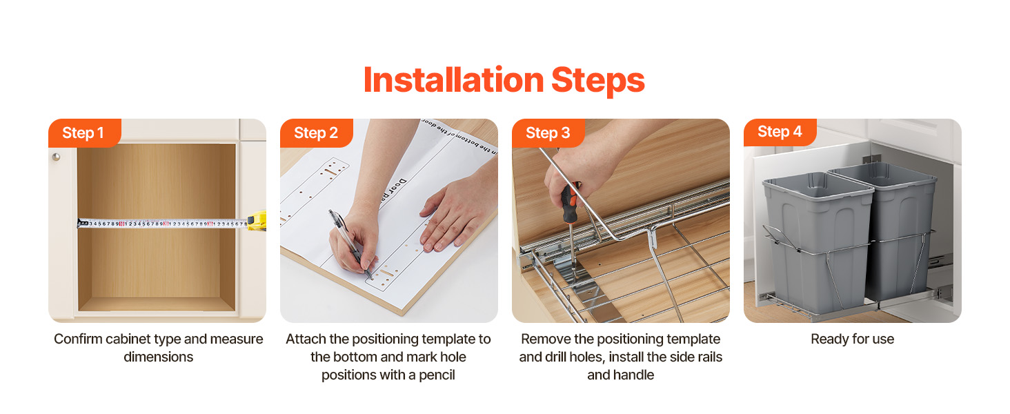 Výsuvnú nádobu na odpadky ľahko nainštalujete za niekoľko minút. Pomocou priložených montážnych otvorov a skrutiek ho možno rýchlo namontovať na vašu skrinku. Konštrukcia s rukoväťou vám uľahčí otváranie kuchynskej skrinky a vyťahovanie odpadkového koša, ktorý je čistý a hygienický.