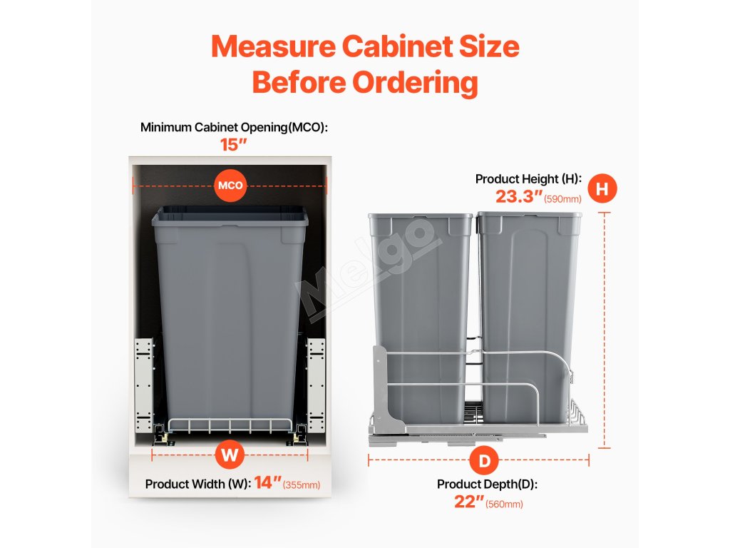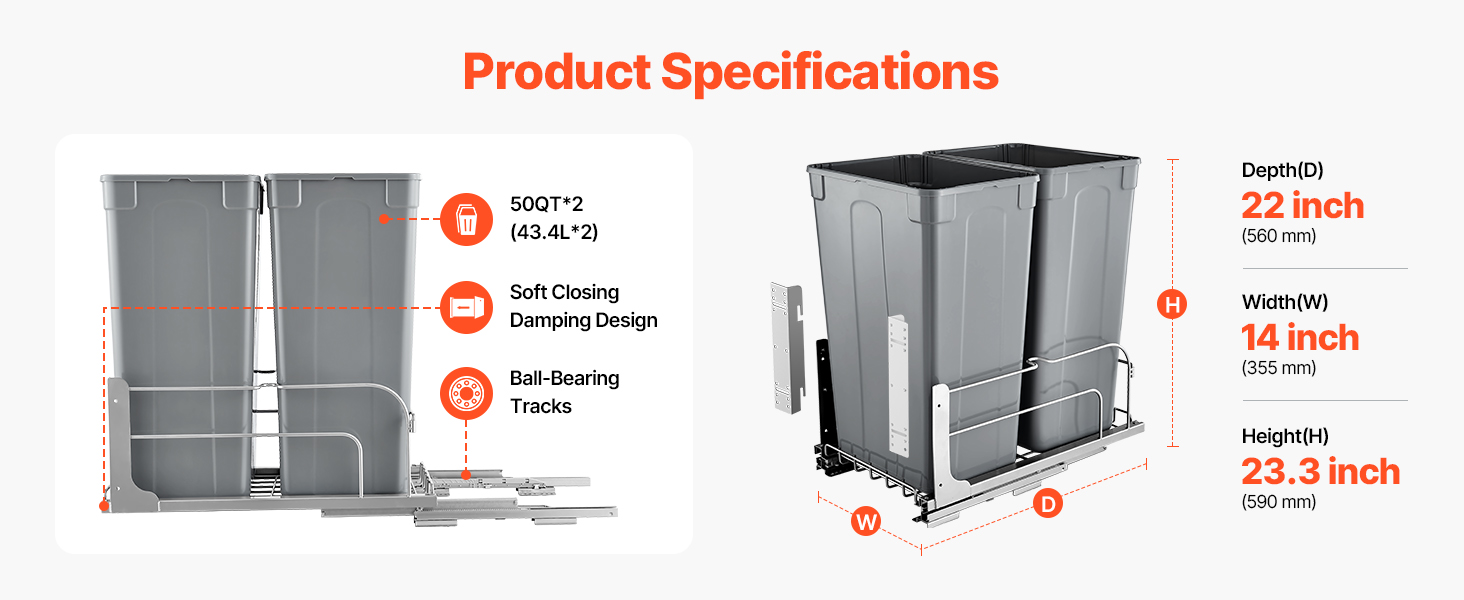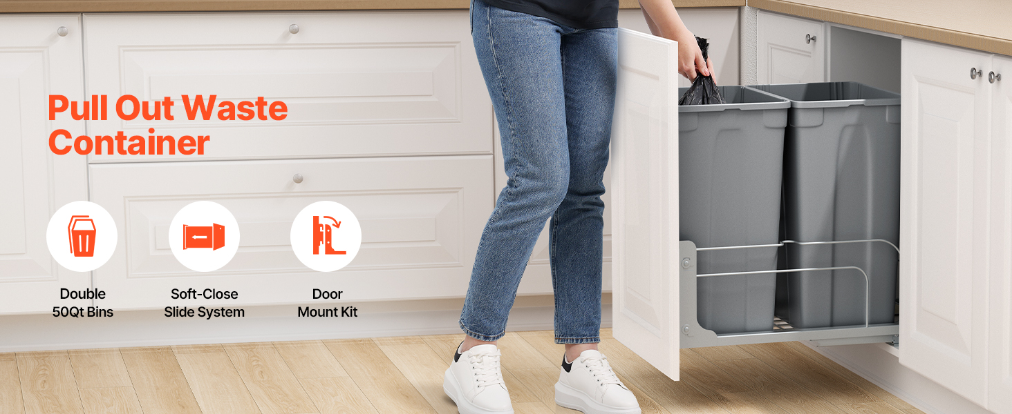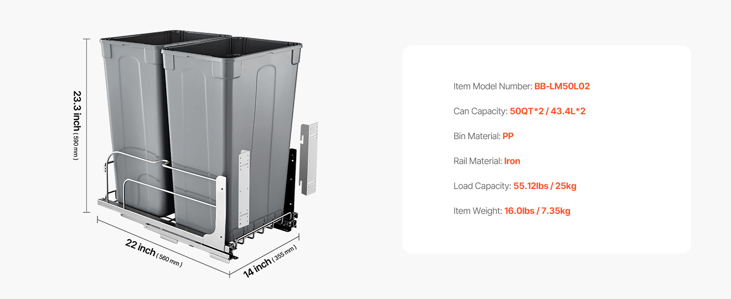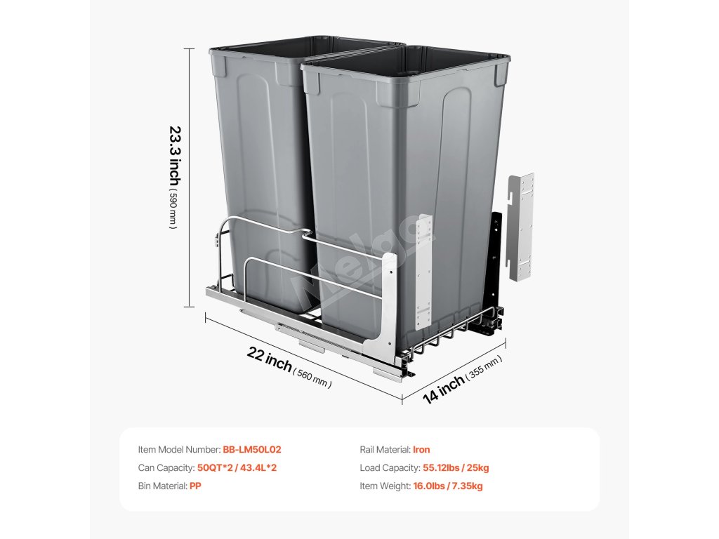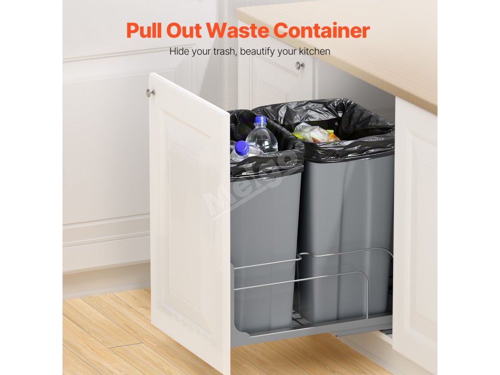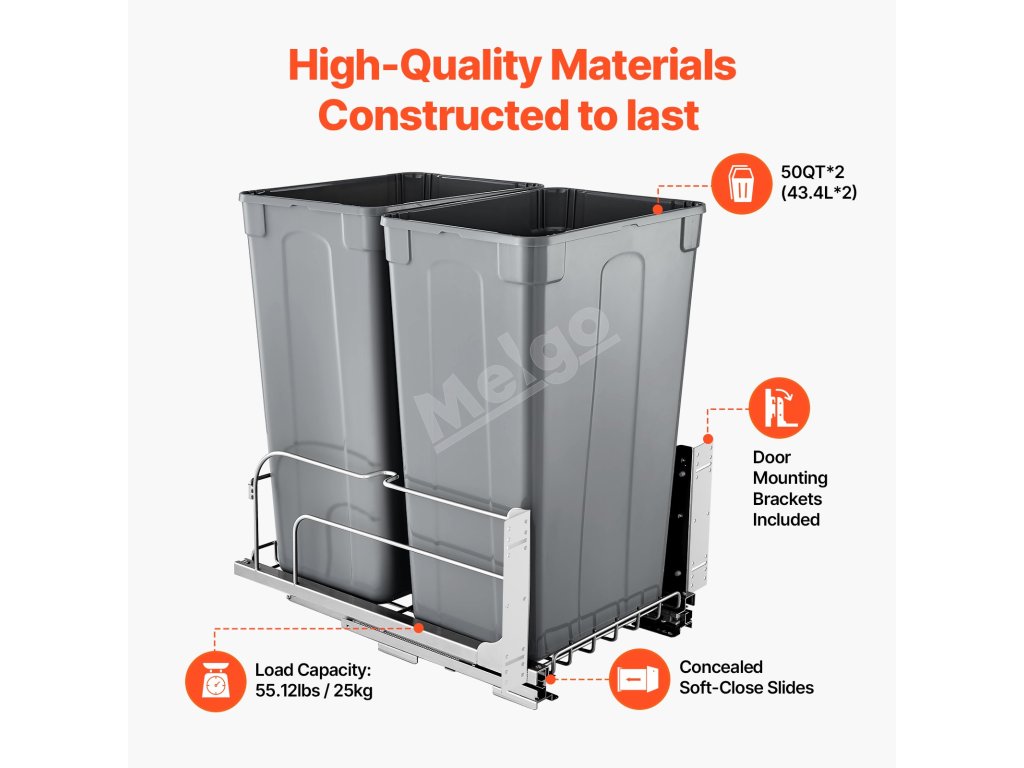 veľká kapacita 50QT + 50QT na maximalizáciu priestoru v kuchyni. Odpadkový kôš pod kuchynskú linku pojme až 66 lbs / 30 kg odpadu.