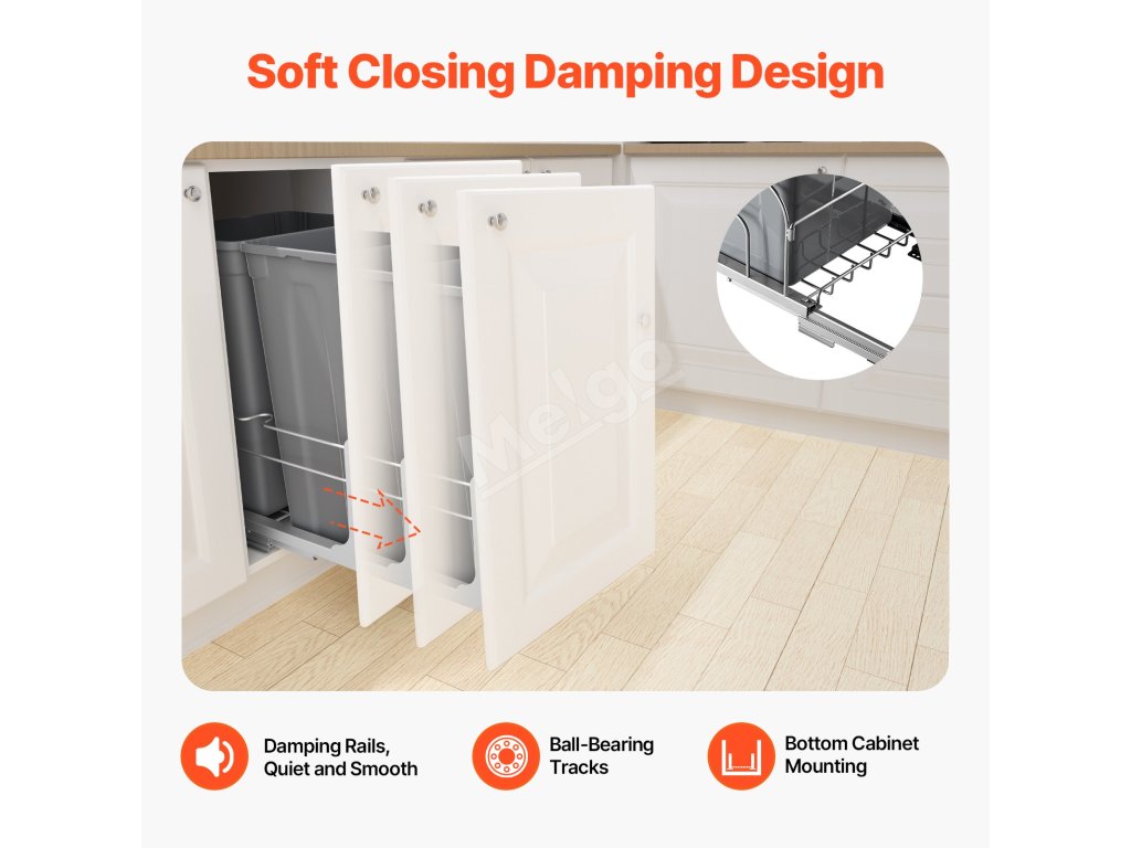 Výsuvný odpadkový kôš využíva vysokokvalitné tlmiace klzáky s technológiou soft-close, ktoré umožňujú plynulé a tiché zasúvanie a vysúvanie koša. Odpadkový kôš už nemusíte neustále nastavovať - vyhadzovanie odpadkov sa stáva jednoduchým a pohodlným.