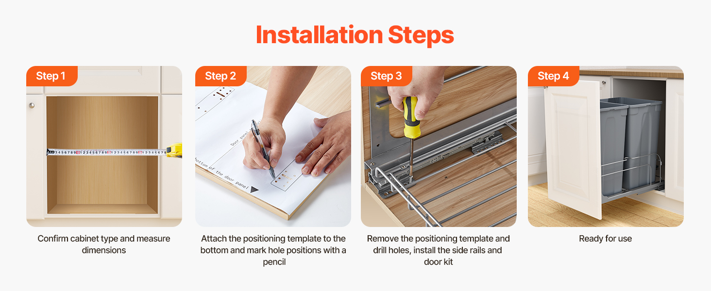 Výsuvnú nádobu na odpadky ľahko nainštalujete za niekoľko minút. Pomocou priložených montážnych otvorov a skrutiek ho možno rýchlo namontovať na vašu skrinku. Dodáva sa s dverovou súpravou na inštaláciu na dvere skrinky, vďaka čomu je vysúvanie odpadkového koša pohodlné.