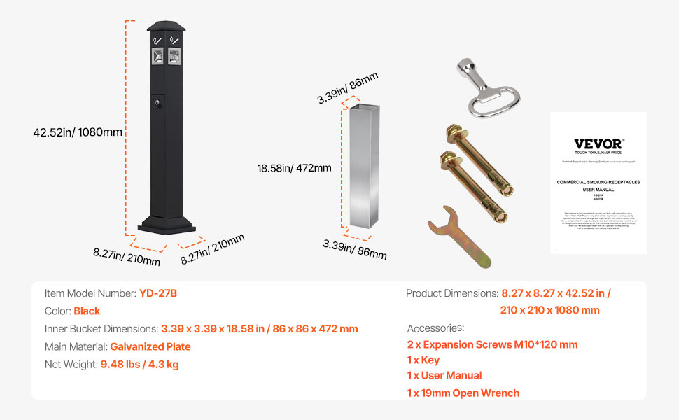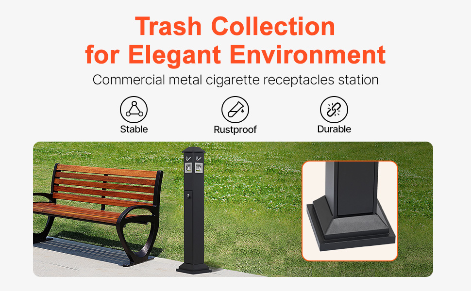 Táto nádoba na cigaretové ohorky je vyrobená z vysokokvalitného ťažkého železa s antikoróznym povlakom, je odolná voči korózii a navrhnutá na dlhodobé používanie, čím poskytuje spoľahlivé riešenie na likvidáciu cigariet.
