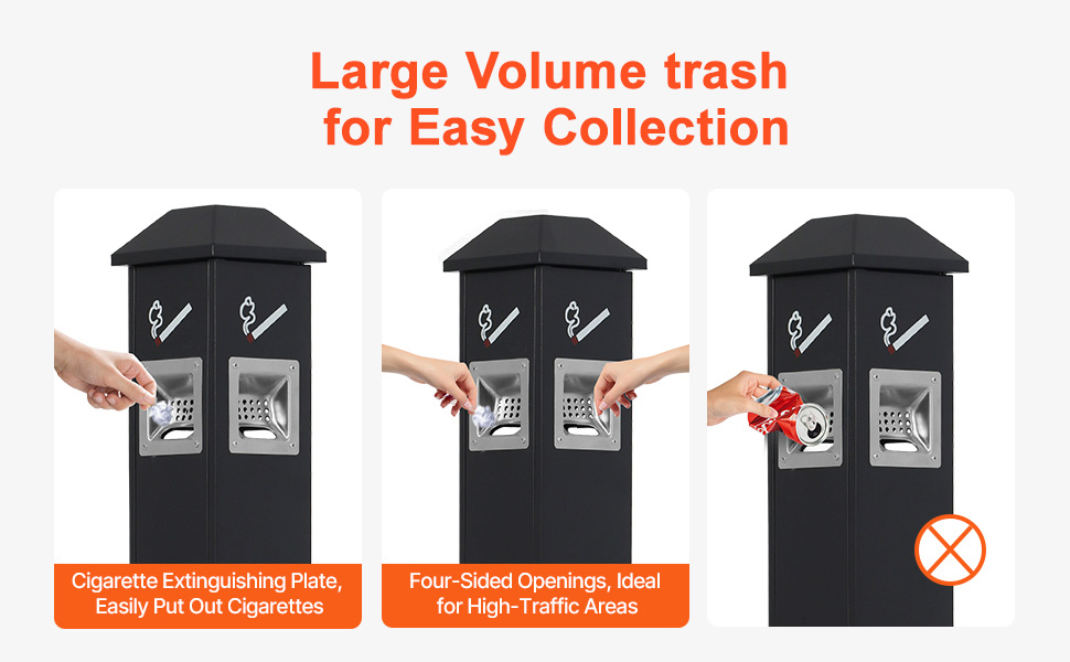 Nádoba na cigaretové ohorky má otvory na všetkých štyroch stranách, čo uľahčuje likvidáciu cigaretových ohorkov z akéhokoľvek smeru. Táto konštrukcia zaručuje, že za sebou nezostanú nedopalky ani popol, a umožňuje veľkokapacitný zber.