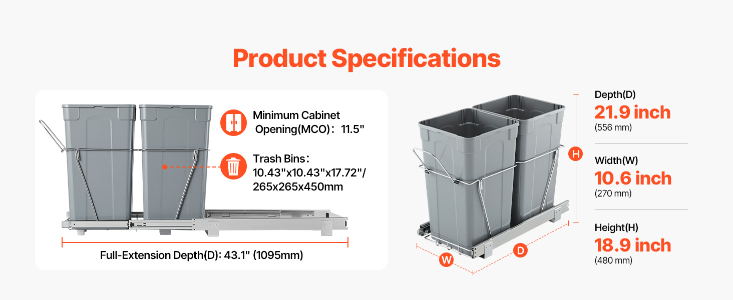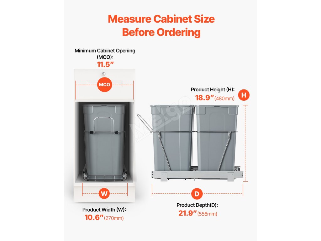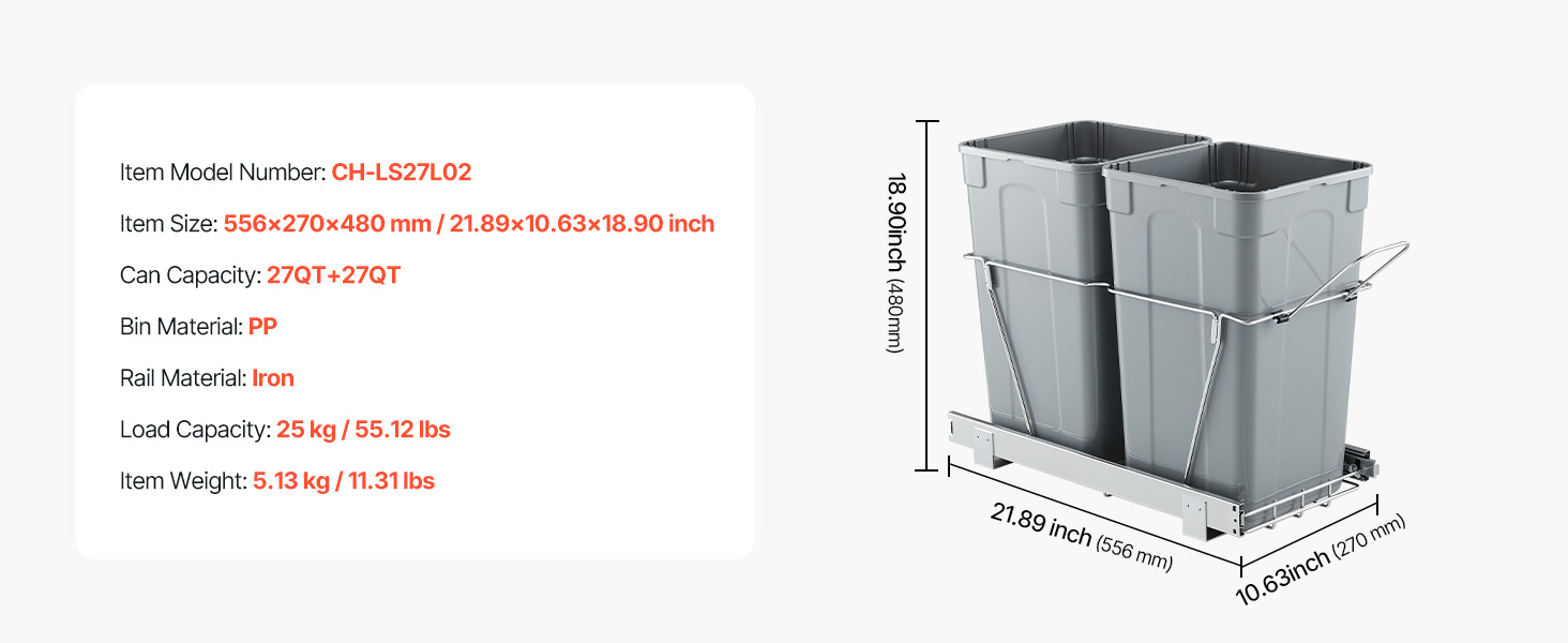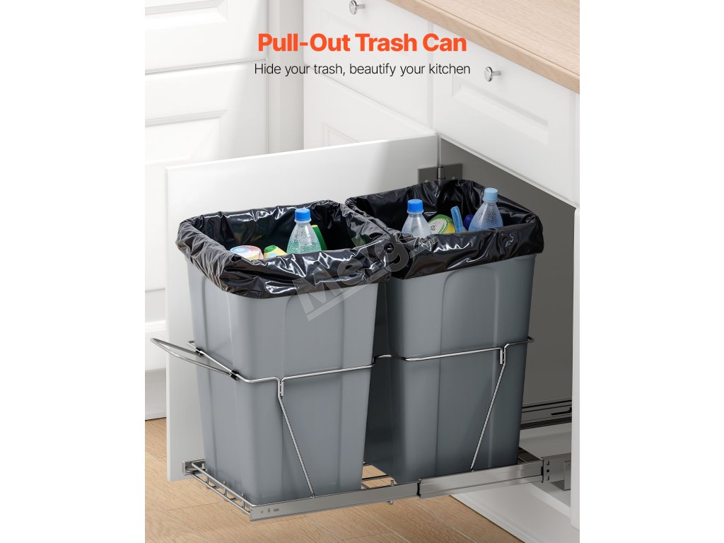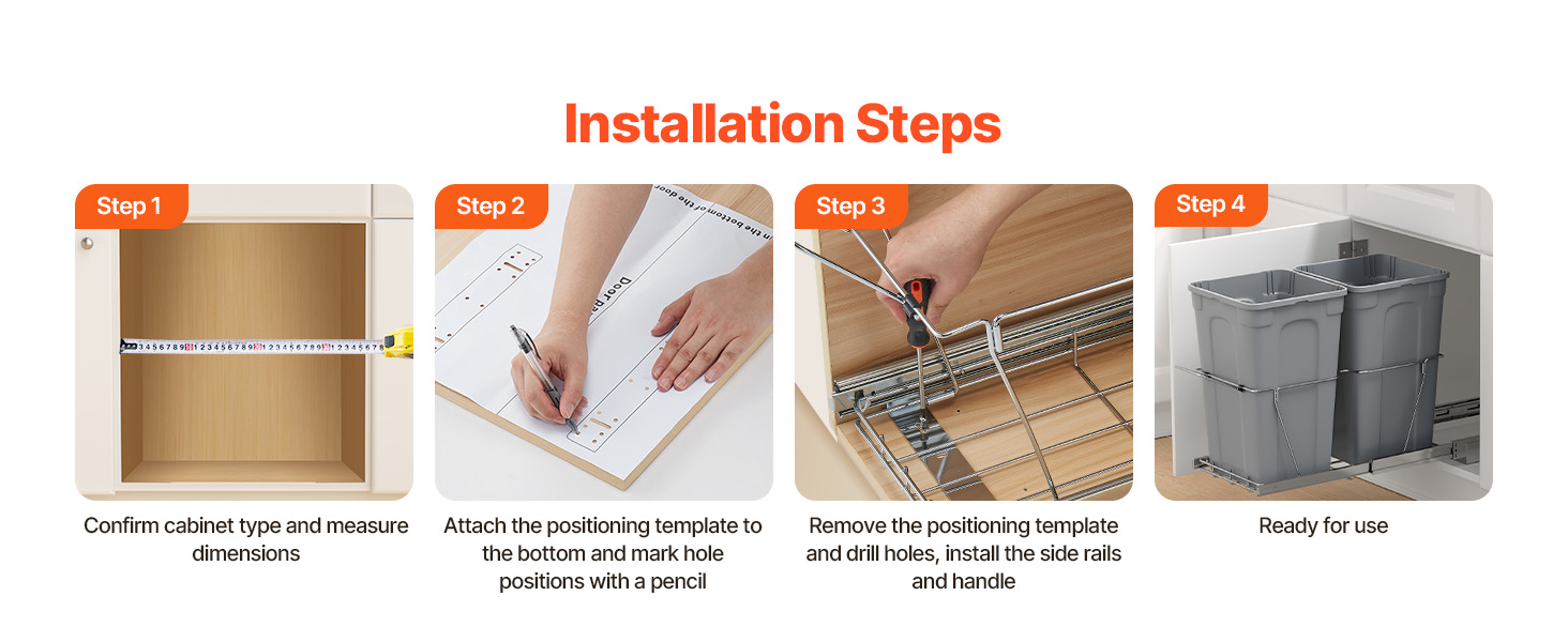 Výsuvnú nádobu na odpadky ľahko nainštalujete za niekoľko minút. Pomocou priložených montážnych otvorov a skrutiek ho možno rýchlo namontovať na vašu skrinku. Konštrukcia s rukoväťou vám uľahčí otváranie kuchynskej skrinky a vyťahovanie odpadkového koša, ktorý je čistý a hygienický.