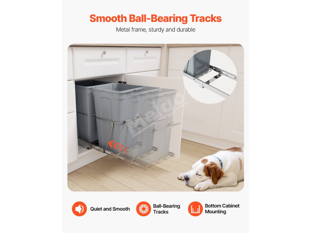 Výsuvný odpadkový kôš využíva vysokokvalitné hladké oceľové guľôčkové klzáky, ktoré umožňujú plynulé a tiché zasúvanie a vysúvanie koša. Odpadkový kôš už nemusíte neustále nastavovať - vyhadzovanie odpadu sa stáva jednoduchým a pohodlným.