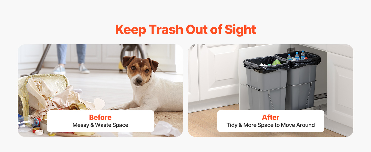 Kedykoľvek potrebujete vyhodiť odpadky, jednoducho vytiahnite kôš zo základnej skrinky. Ušetríte tak miesto na podlahe a vaša kuchyňa bude čistejšia a usporiadanejšia. Účinne zabraňuje deťom alebo domácim zvieratám, aby ho náhodne prevrátili, čím sa zachováva čistota.