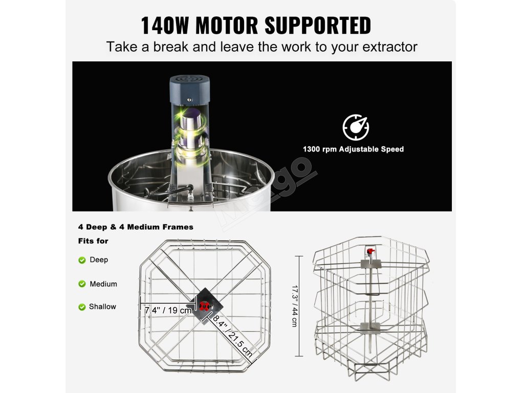 Elektrický včelársky medomet na 4/8 rámov, nerezová oceľ, s motorom
