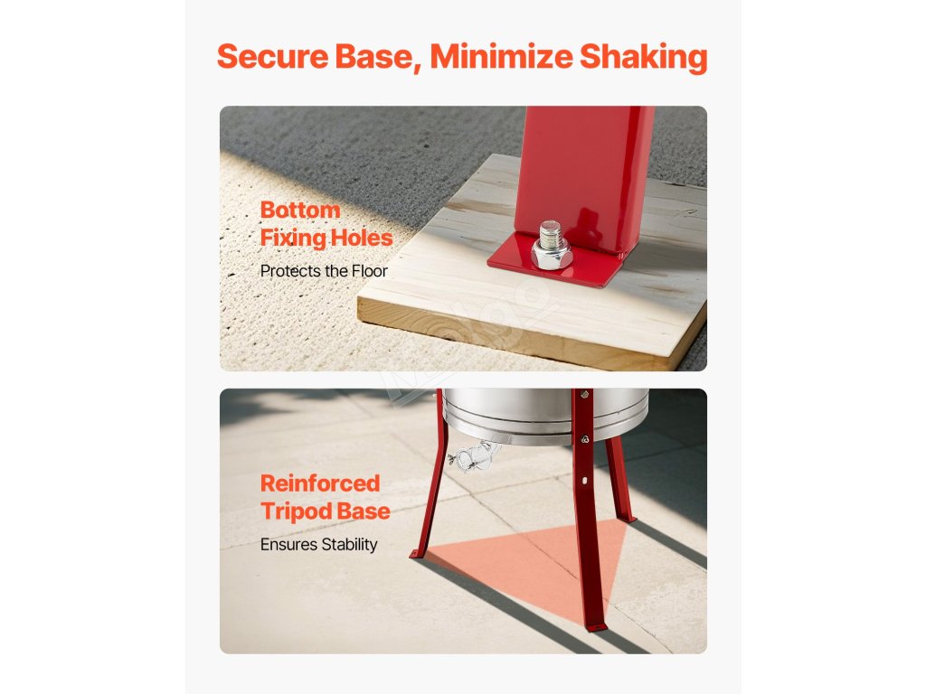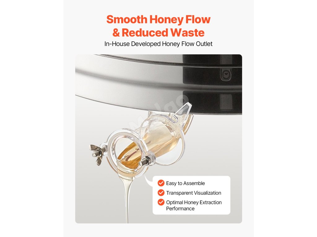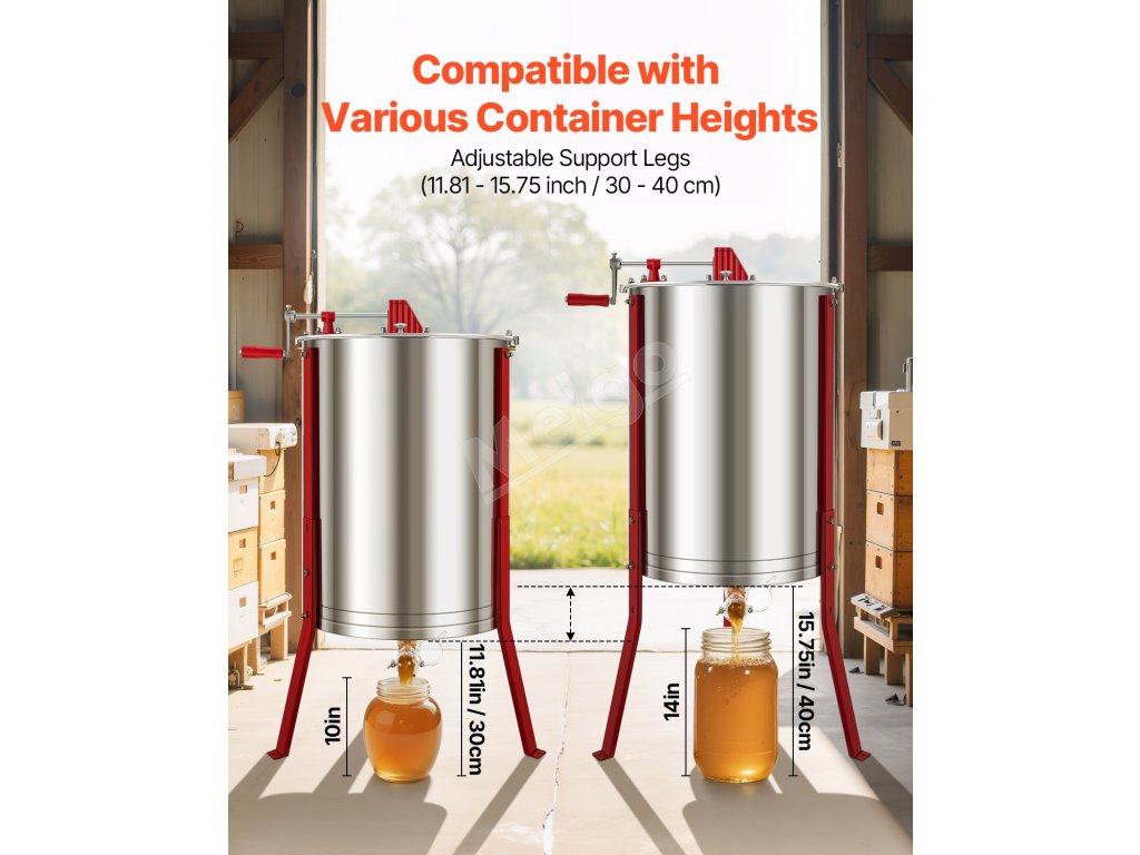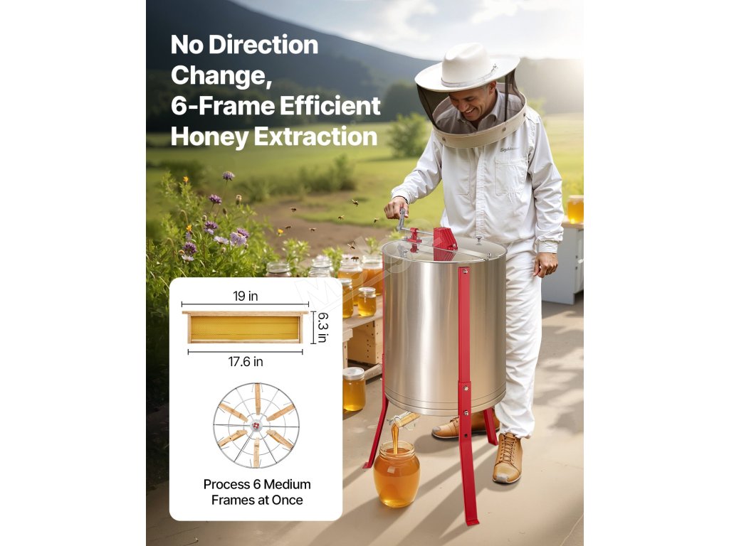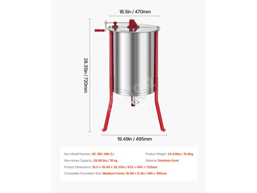 Tento 6-rámový medomet má nastaviteľnú výšku, robustný rám z nehrdzavejúcej ocele pre stabilnú prevádzku. So všetkým potrebným príslušenstvom sa ľahko používa, je vhodný pre stredné a plytké rámy a ponúka plynulé vytáčanie medu s nastaviteľnou rýchlosťou pre optimálnu účinnosť.