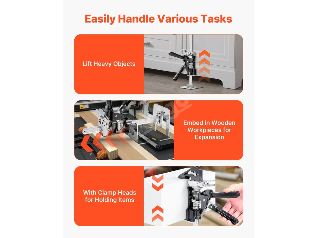 Podporná doska nášho ručného zdviháka ľahko vkĺzne do úzkych priestorov pod ťažké predmety, takže zdvíhanie a rozkladanie je hračka. Môže dokonca slúžiť aj ako svorka pri práci s drevom a pevne držať vaše veci. Kombinuje funkcie zdvíhania, rozširovania a upínania, vďaka čomu bude vaša práca pohodlnejšia.